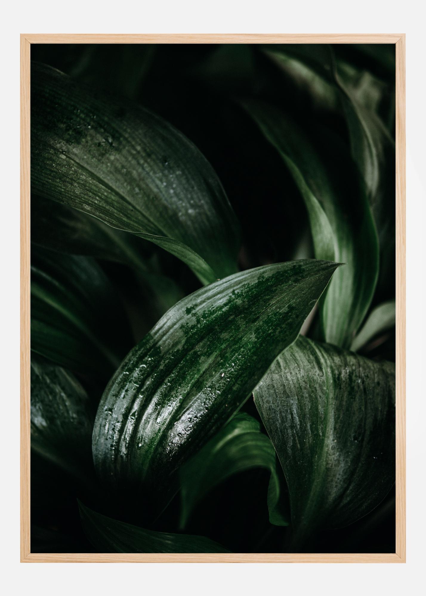 Μια κοντινή άποψη από υγρά φύλλα που καλύπτουν με πυκνότητα την αφίσα. Οι σταγόνες νερού πάνω στα φύλλα δημιουργούν μια λαμπερή ατμόσφαιρα. Το σκοτεινό, θολό φόντο απεικονίζει άλλα φύλλα που αγωνίζονται να φανούν. Αυτή η τέλεια ομορφιά είναι ιδανική για το σπίτι σας.