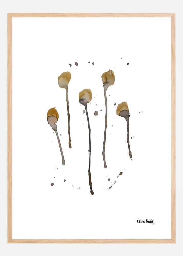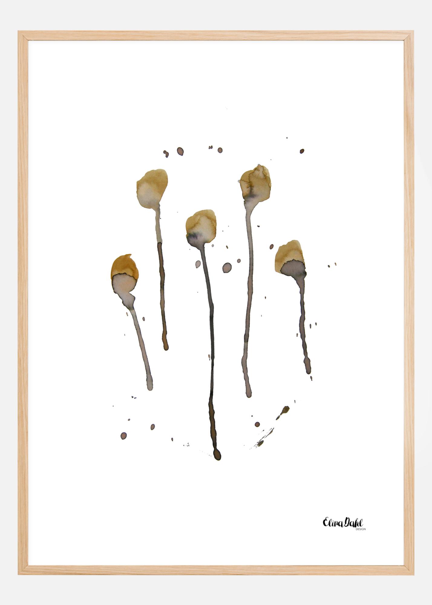 Μια βοτανική εκτύπωση με πέντε μικρούς ανθοφόρους μίσχους. Τοποθετημένοι σε λευκό φόντο, οι πέντε καφέ και γκρι ανθοφόροι μίσχοι στέκονται όρθιοι στο κέντρο της αφίσας. Καφέ πιτσιλιές περιβάλλουν τυχαία τους μίσχους. Μια υπέροχη αφίσα για όλους όσους αγαπούν τα φυτά.