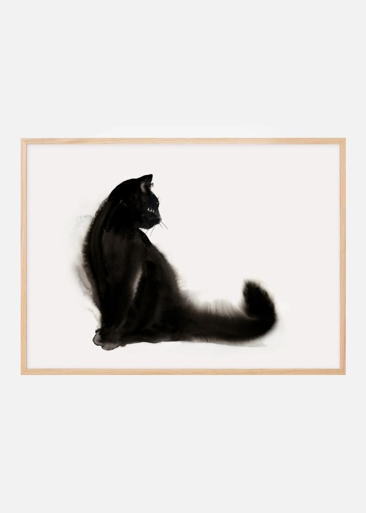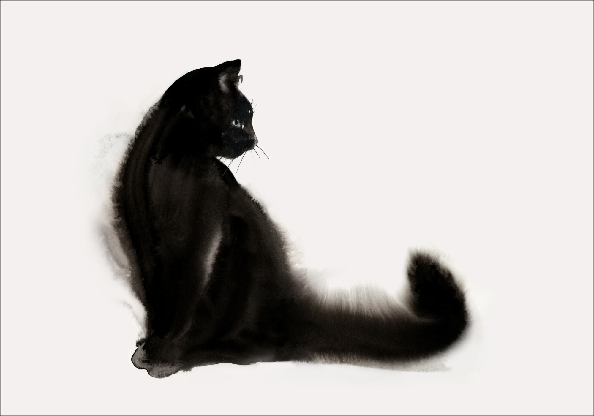 Μια όμορφη εκτύπωση μιας μαύρης βερμανής γάτας. Σε λευκό φόντο, η μαύρη γάτα κοιτάζει πάνω από τον ώμο της σαν να παρατηρεί κάτι. Το φυσικό φως φωτίζει τα μπροστινά πόδια της γάτας και δημιουργεί μια λευκή κηλίδα. Μια φανταστική αφίσα για τους λάτρεις των γατών.