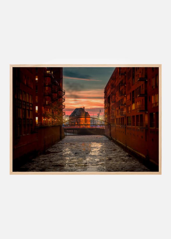 Ηλιοβασίλεμα πάνω από την παλιά αποθήκη Speicherstadt στο Αμβούργο με τα κανάλια του και τα νεογοτθικά κτίρια από τούβλα. Η φωτογραφία από την περιοχή διατηρητέων κτιρίων ταιριάζει όμορφα στο σπίτι κάποιου με ενδιαφέρον για την αρχιτεκτονική ή την ιστορία. Η αφίσα φαίνεται καλύτερα σε ένα λεπτό μεταλλικό πλαίσιο που ταιριάζει με την αυστηρή αρχιτεκτονική και είναι κομψή στον τοίχο μαζί με άλλες αστικές εικόνες.