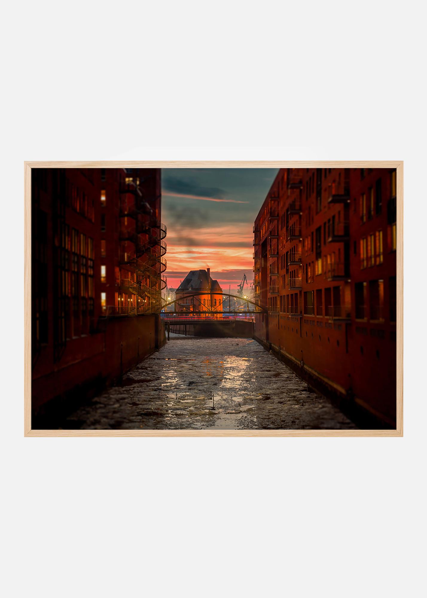 Ηλιοβασίλεμα πάνω από την παλιά αποθήκη του Speicherstadt στο Αμβούργο με τα κανάλια του και τα νεογοτθικά τούβλινα κτίρια. Η φωτογραφία από την προστατευόμενη περιοχή κληρονομιάς ταιριάζει υπέροχα στο σπίτι ενός λάτρη της αρχιτεκτονικής ή της ιστορίας. Η αφίσα δείχνει καλύτερα σε ένα λεπτό μεταλλικό πλαίσιο που ταιριάζει με την αυστηρή αρχιτεκτονική και φαίνεται όμορφη στον τοίχο μαζί με άλλες εικόνες της πόλης.