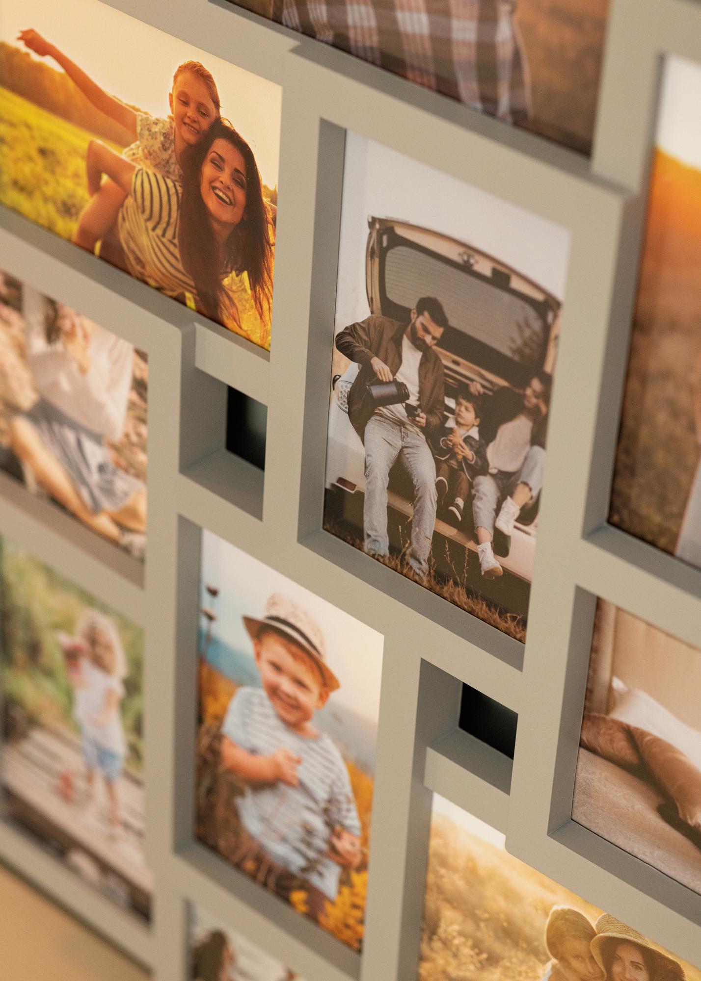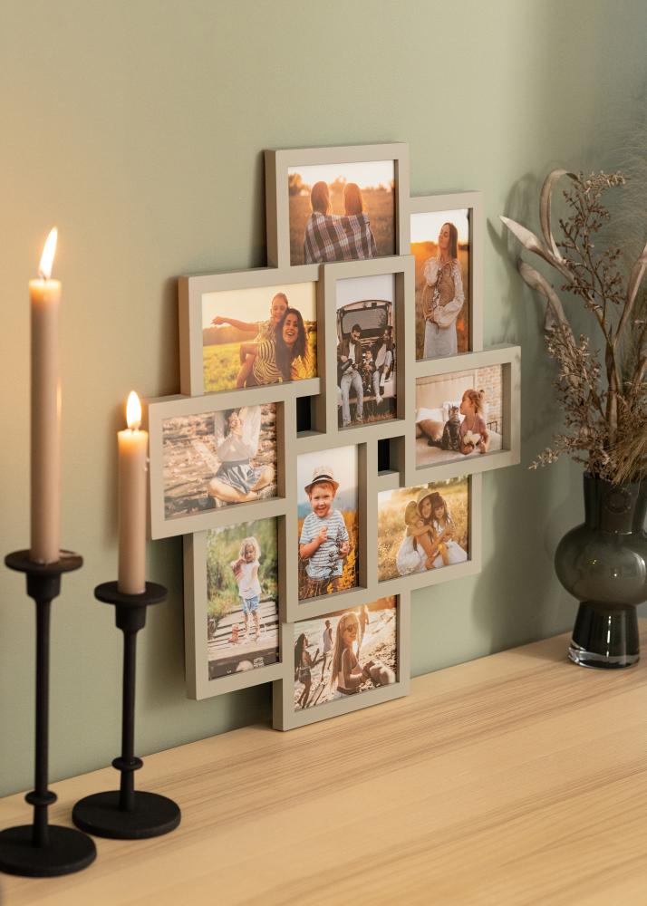 Αυτή είναι μια κορνίζα κολάζ με χώρο για 10 φωτογραφίες 10x15 εκ. Η κορνίζα συνδυάζει φωτογραφίες σε κατακόρυφη και οριζόντια διάταξη, με αποτέλεσμα μια πολύ δυναμική έκφραση. Το εκλεπτυσμένο γκρι χρώμα θα αναδείξει τις αποχρώσεις στις φωτογραφίες σας και θα επιτρέψει στα θέματα να βρίσκονται στο κέντρο της προσοχής. Τοποθετείτε τα θέματα σας στην κορνίζα χαλαρώνοντας το πίσω μέρος, το οποίο συγκρατείται στη θέση του με μικρά περιστρεφόμενα κλιπ. Όλες οι φωτογραφίες συγκρατούνται από ένα μόνο πίσω μέρος και έτσι μπορείτε εύκολα να τοποθετήσετε όλες τις εικόνες στην κορνίζα ταυτόχρονα.