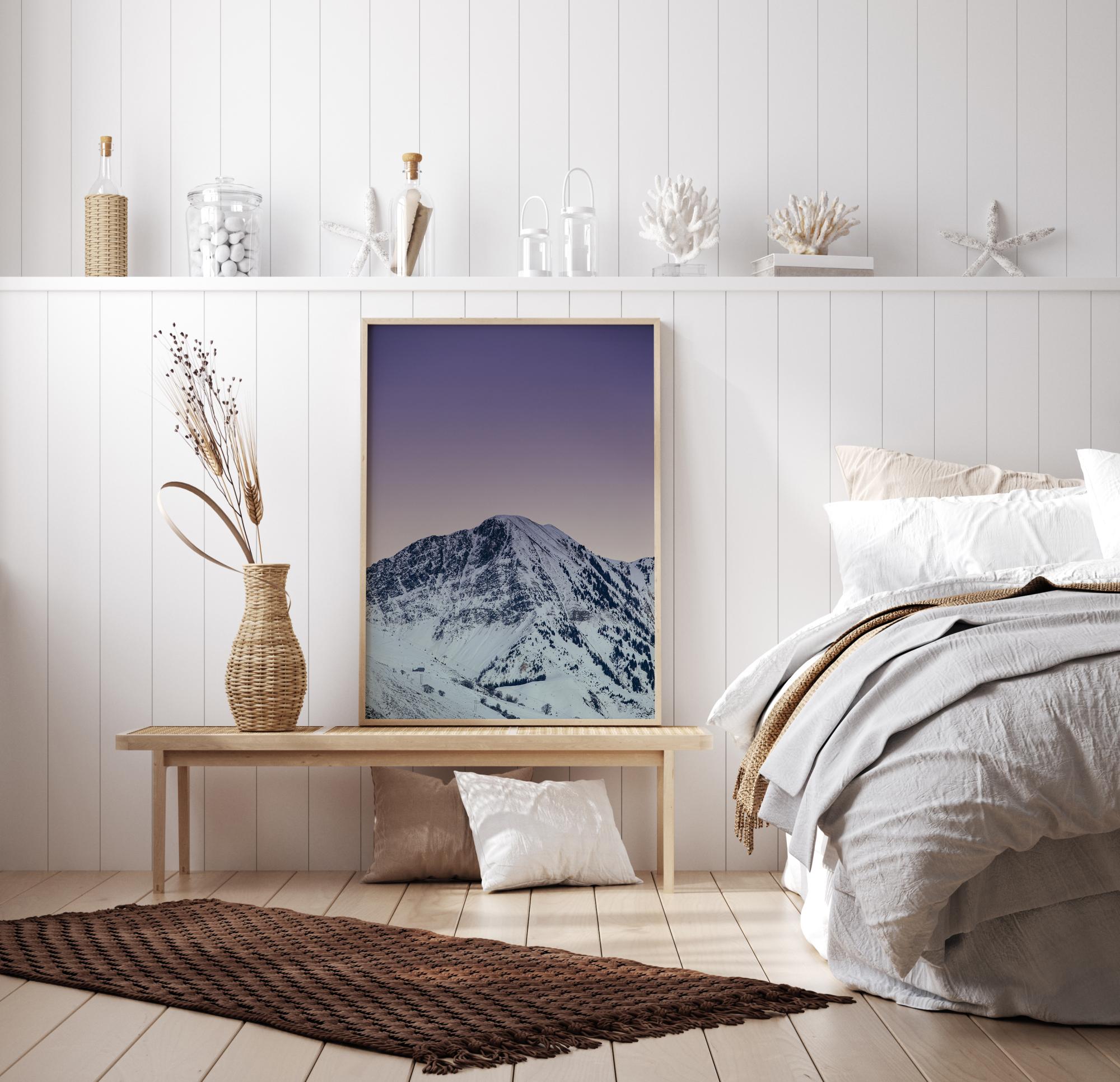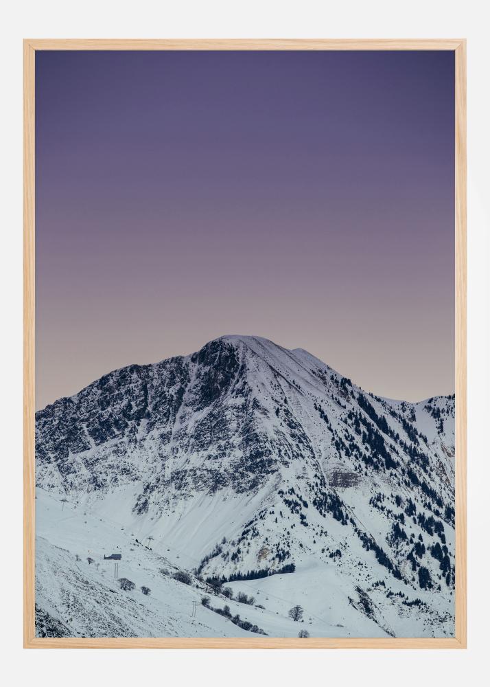 Μια νυχτερινή αφίσα με αστέρια πάνω από ένα μαζικό λευκό βουνό. Αυτό το εντυπωσιακό χιονισμένο βουνό βρίσκεται κάτω από έναν καταπληκτικό μωβ ουρανό. Ο μωβ ουρανός αντανακλάται στις κορυφές των βουνών και δημιουργεί μια ζεστή αίσθηση στο τύπωμα. Μια όμορφη εικόνα για να κρεμάσετε σε ένα κρύο περιβάλλον.