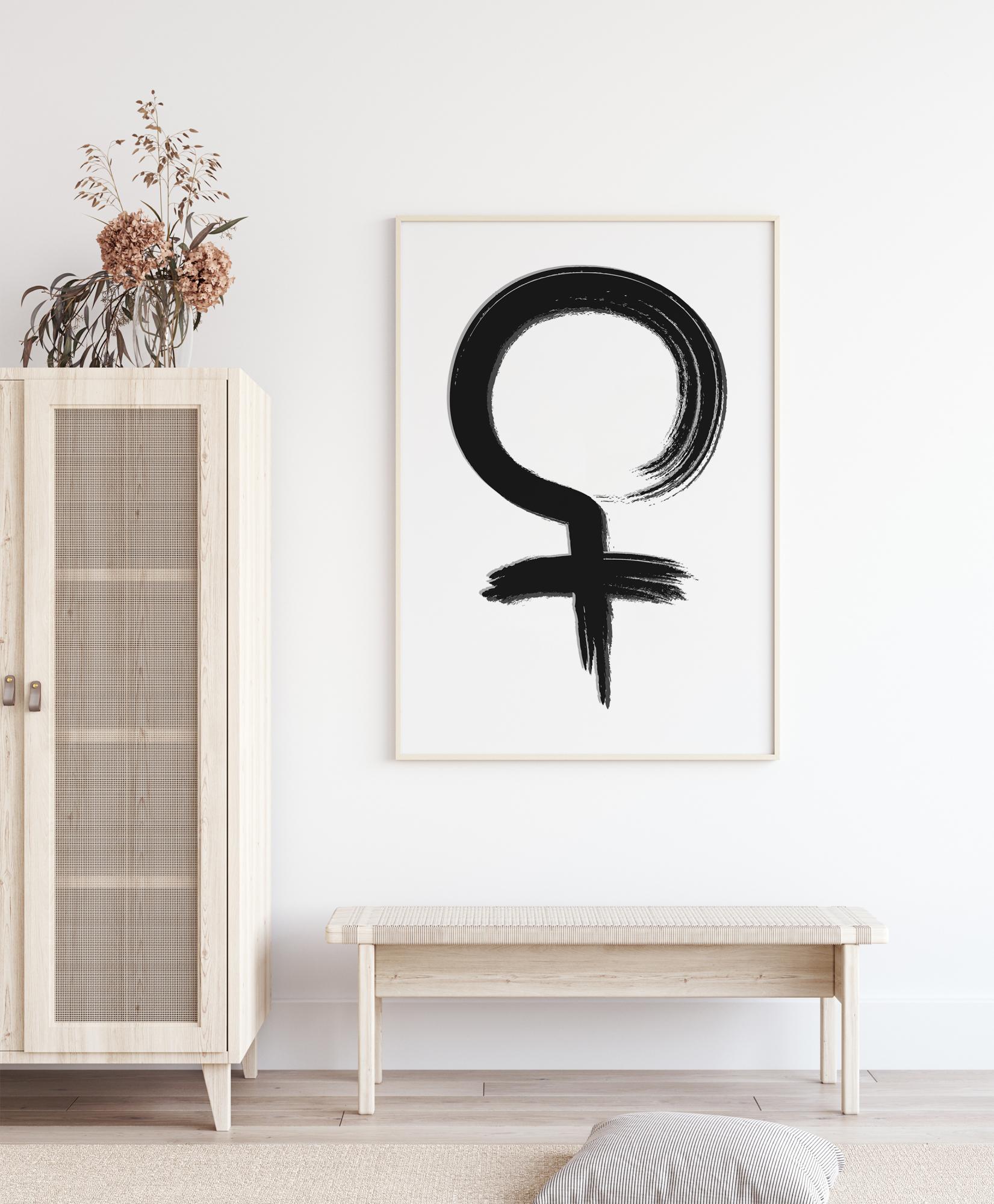 Μια απλή ασπρόμαυρη εκτύπωση που απεικονίζει το σύμβολο για τη γυναίκα με έναν μισό κύκλο. Σε ένα λευκό φόντο, το μαύρο σύμβολο ξεθωριάζει προς το τέλος του δακτυλίου. Ένα τέλειο πόστερ για να κρεμαστεί σε ένα γυναικείο περιβάλλον.