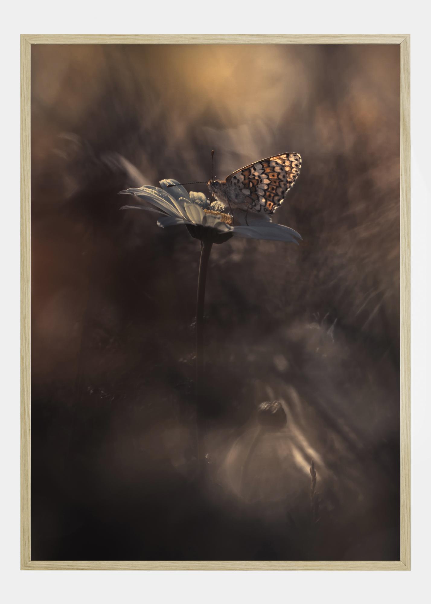Μια τέλεια κοντινή λήψη ενός πορτοκαλί πεταλούδα που κάθεται πάνω σε μια απλή μαργαρίτα. Στο φόντο με παστέλ αποχρώσεις, τα θολά χρώματα αναδεικνύουν το όμορφο και ευαίσθητο λουλούδι και την πεταλούδα. Μια υπέροχη αφίσα που κόβει την ανάσα για να κρεμαστεί πάνω από ένα τζάκι.
