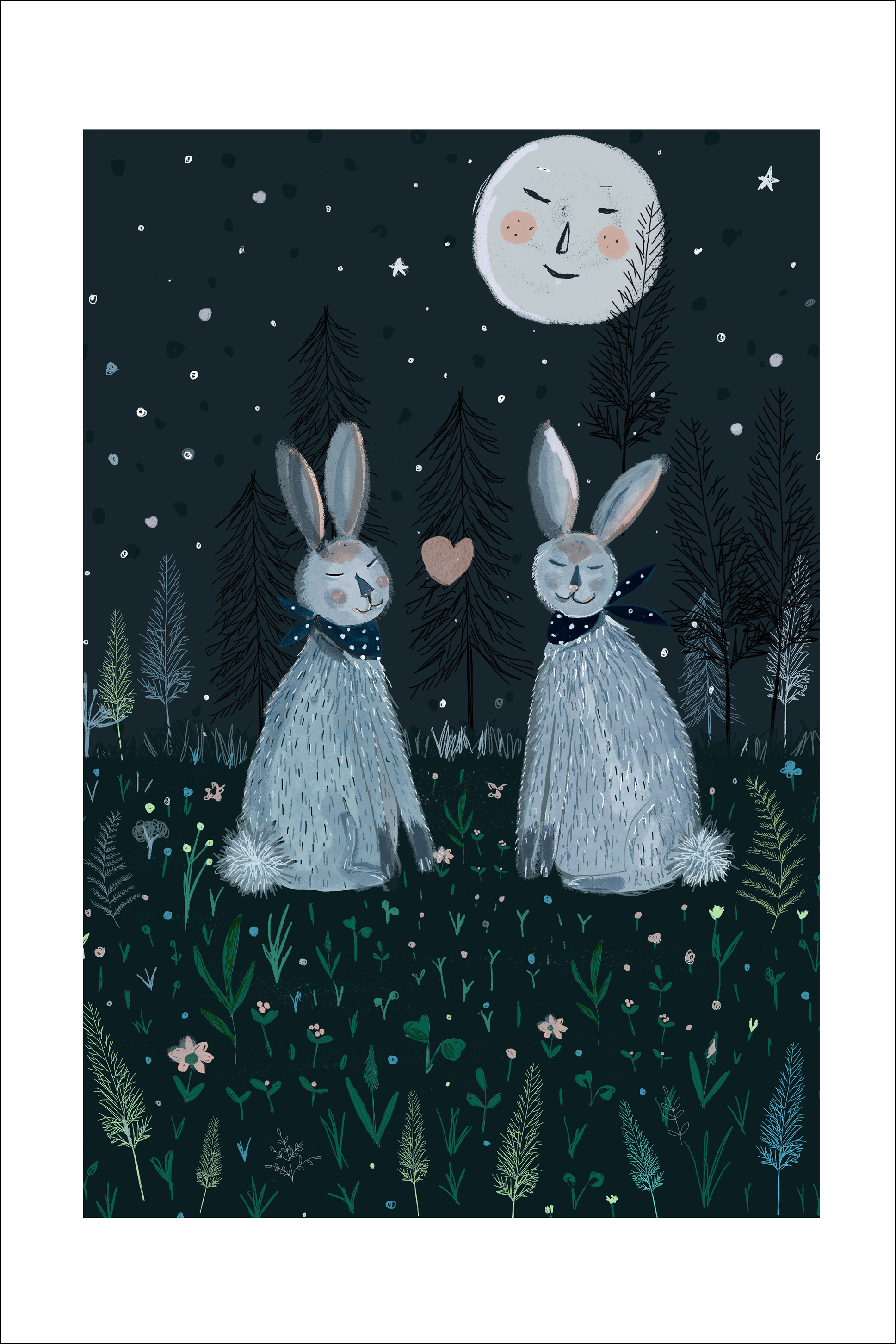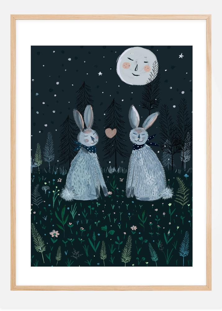 Μια διασκεδαστική αφίσα με το φεγγάρι και τα δασικά κουνέλια που κοιμούνται καλά. Τα αστέρια λάμπουν φωτεινά ενώ τα φυτά του εδάφους στέκονται γύρω τους στη δροσερή βραδινή ατμόσφαιρα. Με κασκόλ δεμένα γύρω από τους λαιμούς των κουνελιών και μια καρδιά τοποθετημένη ανάμεσά τους, αυτή είναι μια τέλεια εκτύπωση για όλους τους ερωτευμένους.