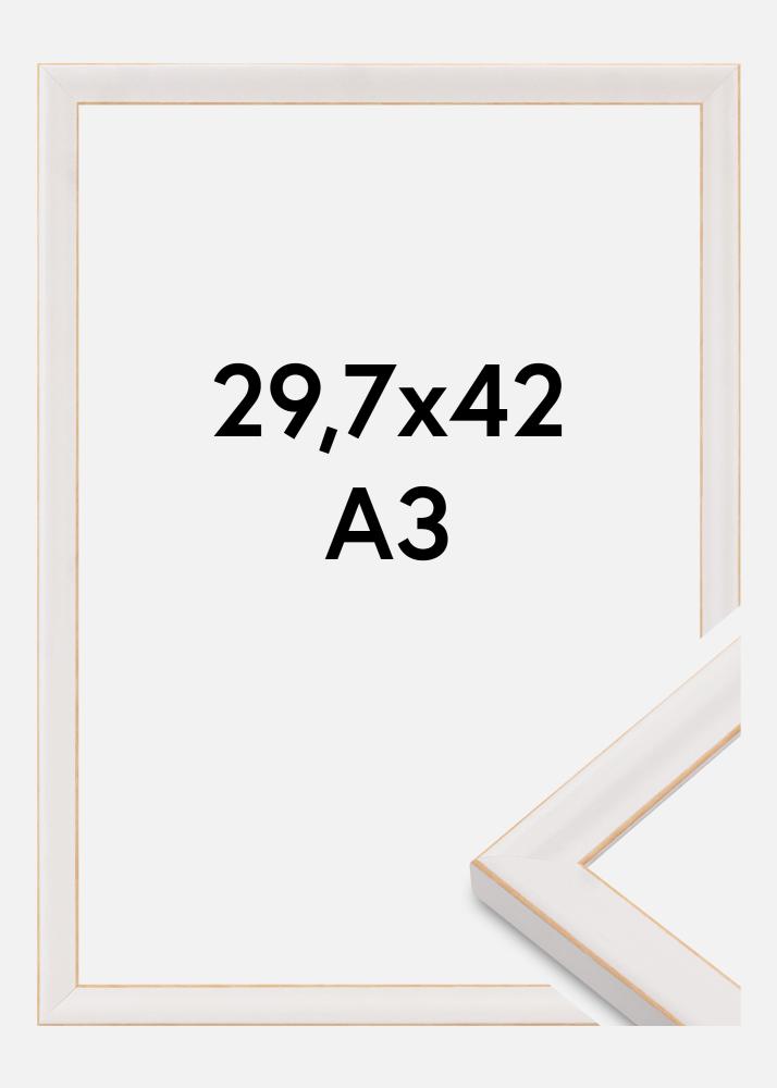 Η κορνίζα είναι κατασκευασμένη από ξύλο και διαθέτει μια ράβδο πλάτους 20 χιλιοστών καθώς και βάθος 16 χιλιοστών. Η όμορφη χρυσή λεπτομέρεια κατά μήκος της εσωτερικής άκρης πλαισιώνει την εικόνα με μια αποκλειστική αίσθηση. Με τις διαστάσεις της στα 29,7 x 42 εκ. ταιριάζει απόλυτα για θέματα σε μορφή A3. Αυτή η κορνίζα φωτογραφιών είναι εξοπλισμένη με μεταλλικά κρεμαστάρια στο πίσω μέρος, γεγονός που την καθιστά εύκολο να κρεμαστεί τόσο οριζόντια όσο και κάθετα ανάλογα με τις ανάγκες σας.