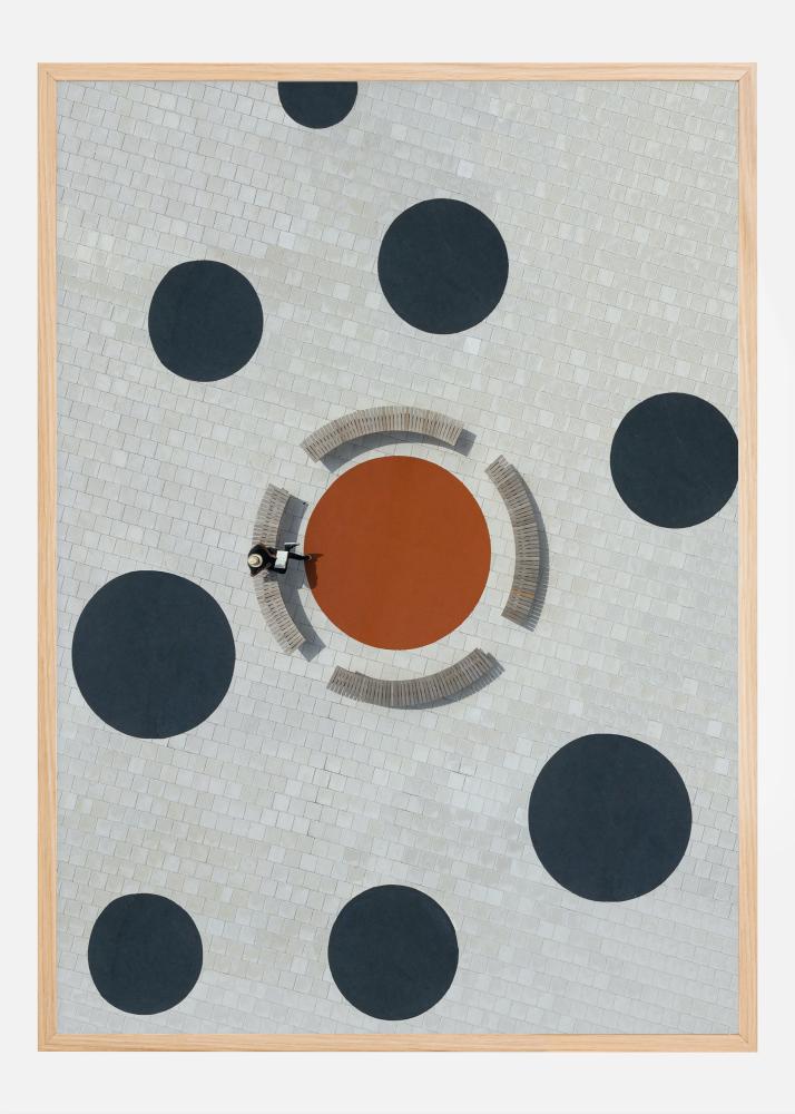 Αυτή η αφίσα της έννοιας συλλαμβάνει μια ξεχωριστή εικόνα από ψηλά ενός ατόμου που διαβάζει, περιτριγυρισμένου από μια συμμετρική και γραφική σύνθεση. Ο αφηρημένος σχεδιασμός της λευκής επιφάνειας με πλακάκια, που διακόπτεται από μεγάλους μαύρους κύκλους και έναν κεντρικό σκουριασμένο κόκκινο κύκλο με παγκάκια, προσφέρει μια ισχυρή οπτική αντίθεση. Αυτή η αφίσα είναι όχι μόνο φόρος τιμής στο σχέδιο και την αρχιτεκτονική, αλλά και μια παιχνιδιάρικη ερμηνεία των καθημερινών σκηνών.