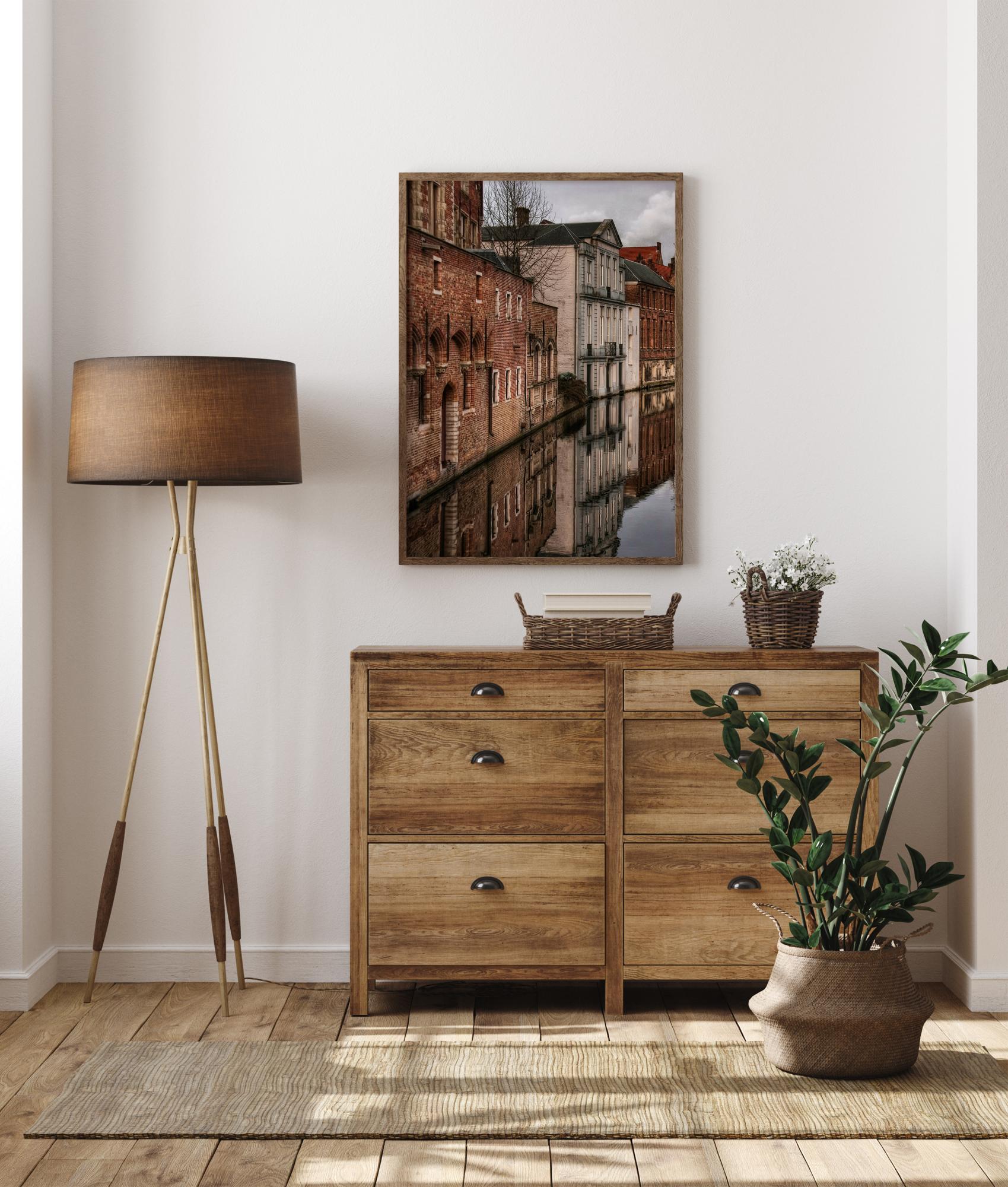 Μια νοσταλγική αφίσα με σειρές από παλιά σπίτια κατά μήκος ενός ποταμού. Τα απλά, ρουστίκ, κόκκινα τούβλινα σπίτια και οι αρχιτεκτονικές λεπτομέρειές τους αντανακλώνται στα ήρεμα νερά παρακάτω. Φανταστείτε τον εαυτό σας να επιπλέει κατά μήκος αυτών των κτηρίων ενώ αναλογίζεστε το παρελθόν.