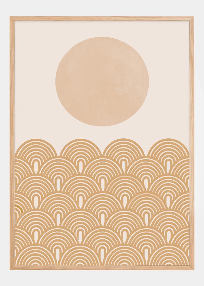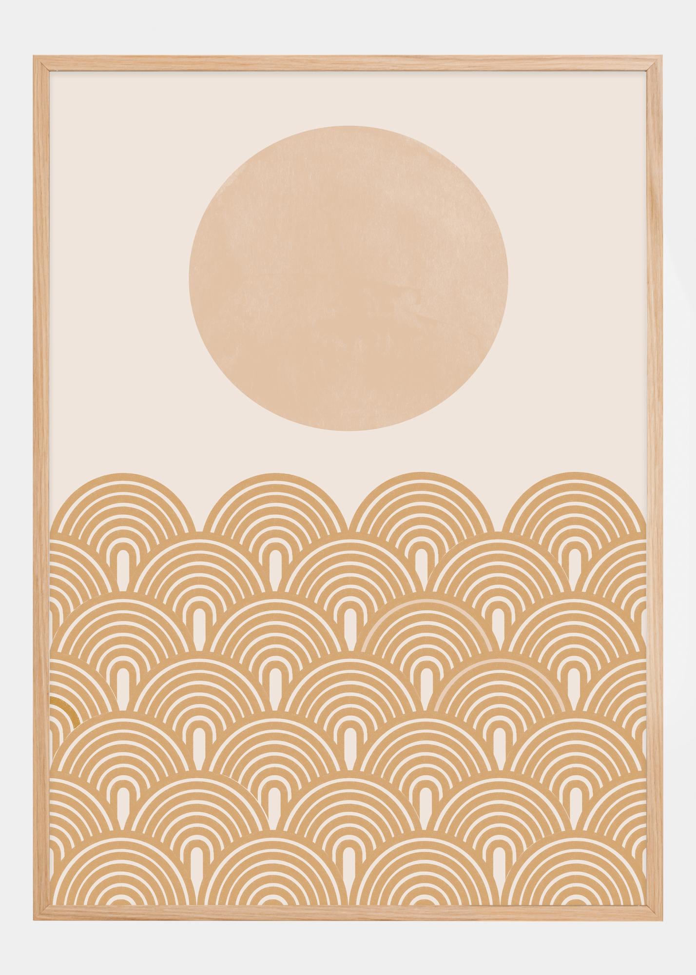 Αυτή η αφίσα είναι μια ηλιόλουστη ερμηνεία των ρετρό στυλ και καλοκαιρινών δονήσεων, όπου ένας μεγάλος, ανοιχτό ροζ κύκλος αιωρείται πάνω από ένα μοτίβο καμπυλωτών στοιχείων σε μια ζεστή τερρακότα απόχρωση. Οι καμπύλες είναι συνδεδεμένες με έναν τρόπο που θυμίζει κύματα ή λόφους, προσδίδοντας μια αίσθηση κίνησης και ζωηρότητας. Η απαλή χρωματική παλέτα συμβάλλει σε μια αίσθηση ζεστασιάς και ηρεμίας.