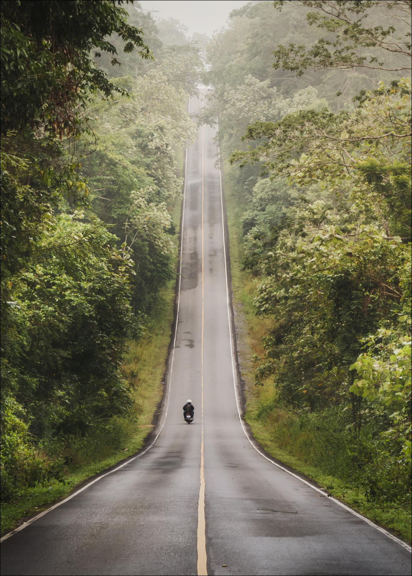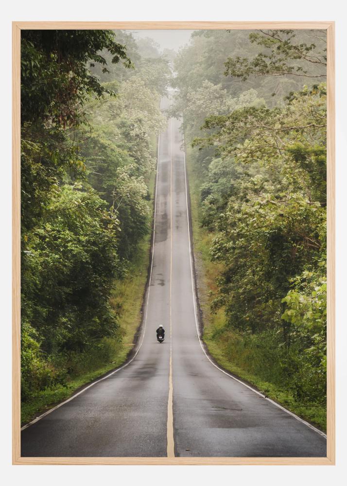 Μια ήρεμη φωτογραφία φύσης με ένα δρόμο και έναν μοναχικό μοτοσικλετιστή που διασχίζει υπέροχα πράσινα φυλώματα. Μια χαλαρωτική και ήρεμη αφίσα που ταιριάζει εξαιρετικά με άλλα αγαπημένα σε έναν μεγαλύτερο τοίχο με κορνίζες.