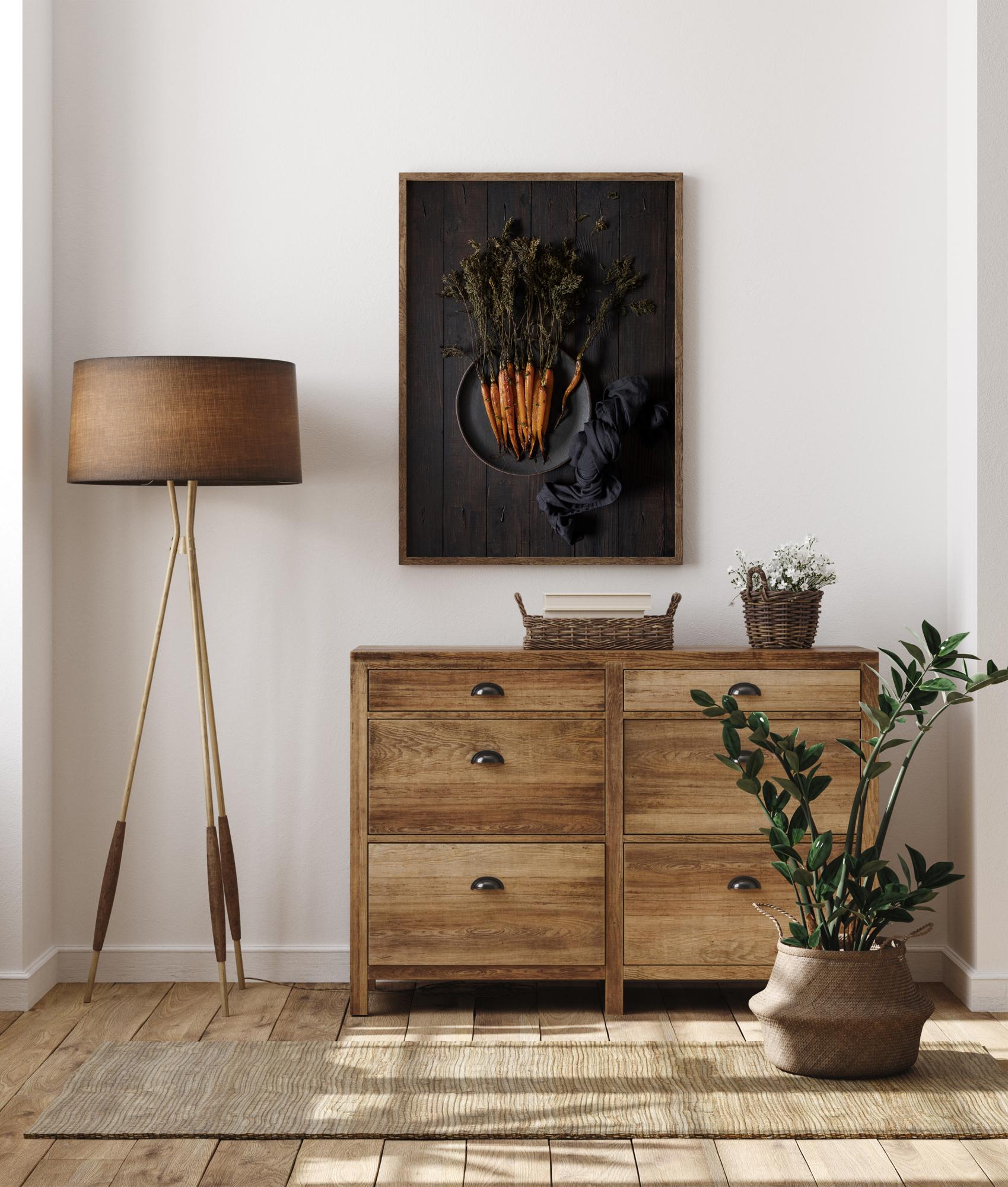 Μια αφίσα μαγειρικής με μια ομάδα από νεοκομμένα καρότα που βρίσκονται σε ένα σκούρο μπλε πιάτο. Τα πορτοκαλί καρότα λάμπουν αρκετά όταν βρίσκονται στο μπλε ναυτικό πιάτο με το σκούρο ξύλο στο παρασκήνιο. Τα μαραμένα φύλλα υποδεικνύουν ότι αυτά τα καρότα είναι έτοιμα να φαγωθούν. Προσθέστε αυτήν στην κουζίνα σας για μια διασκεδαστική foodie ατμόσφαιρα.