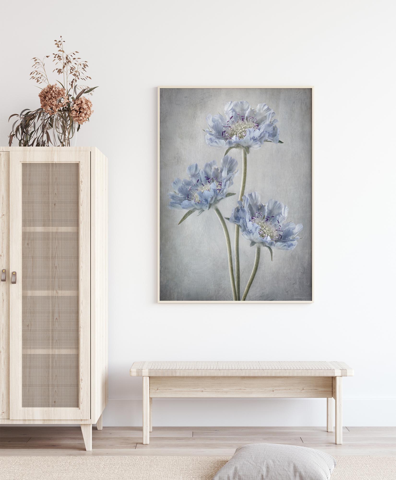 Μια αιθέρια αφίσα με τρία Scabiosa μπροστά σε έναν απαλό γαλάζιο τοίχο. Τα όμορφα μπλε πέταλα κυρτώνουν προς τα πάνω σε αυτόν τον καταπληκτικό πίνακα. Τα λουλούδια φωτίζονται από το απαλότερο λευκό φόντο για να ξεχωρίζουν. Ξυπνήστε με αυτήν την ειρηνική νεκρή φύση στο υπνοδωμάτιό σας.