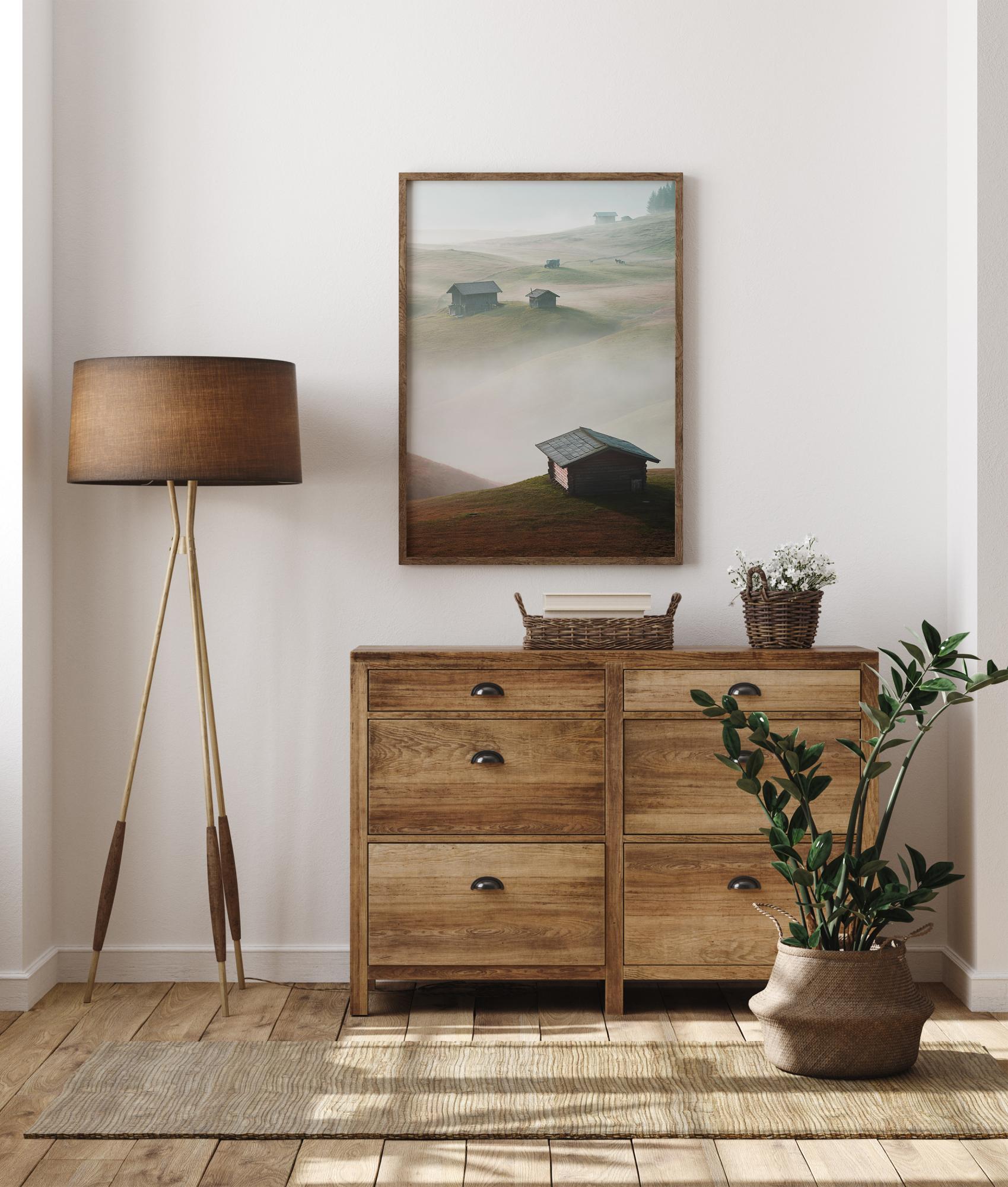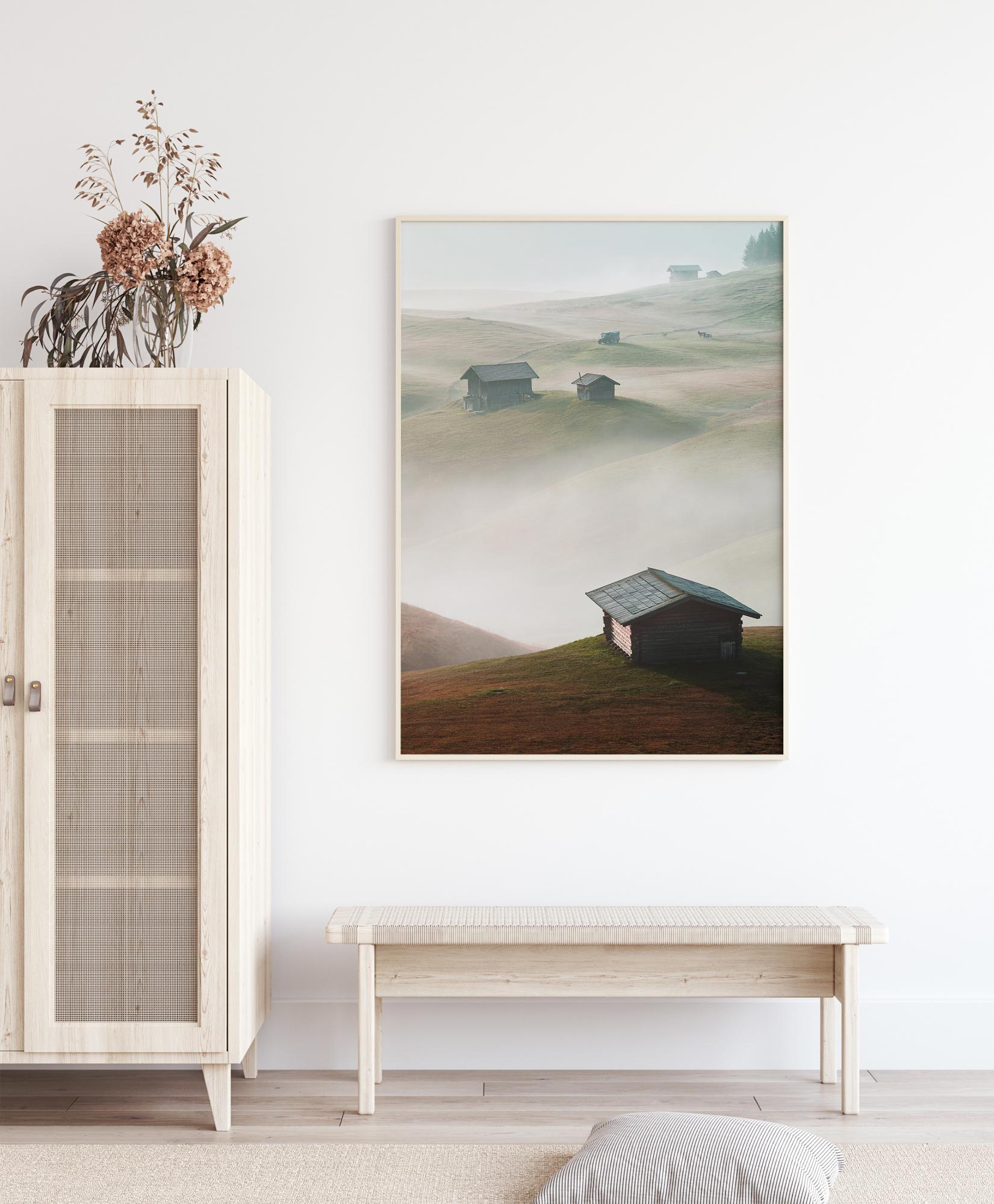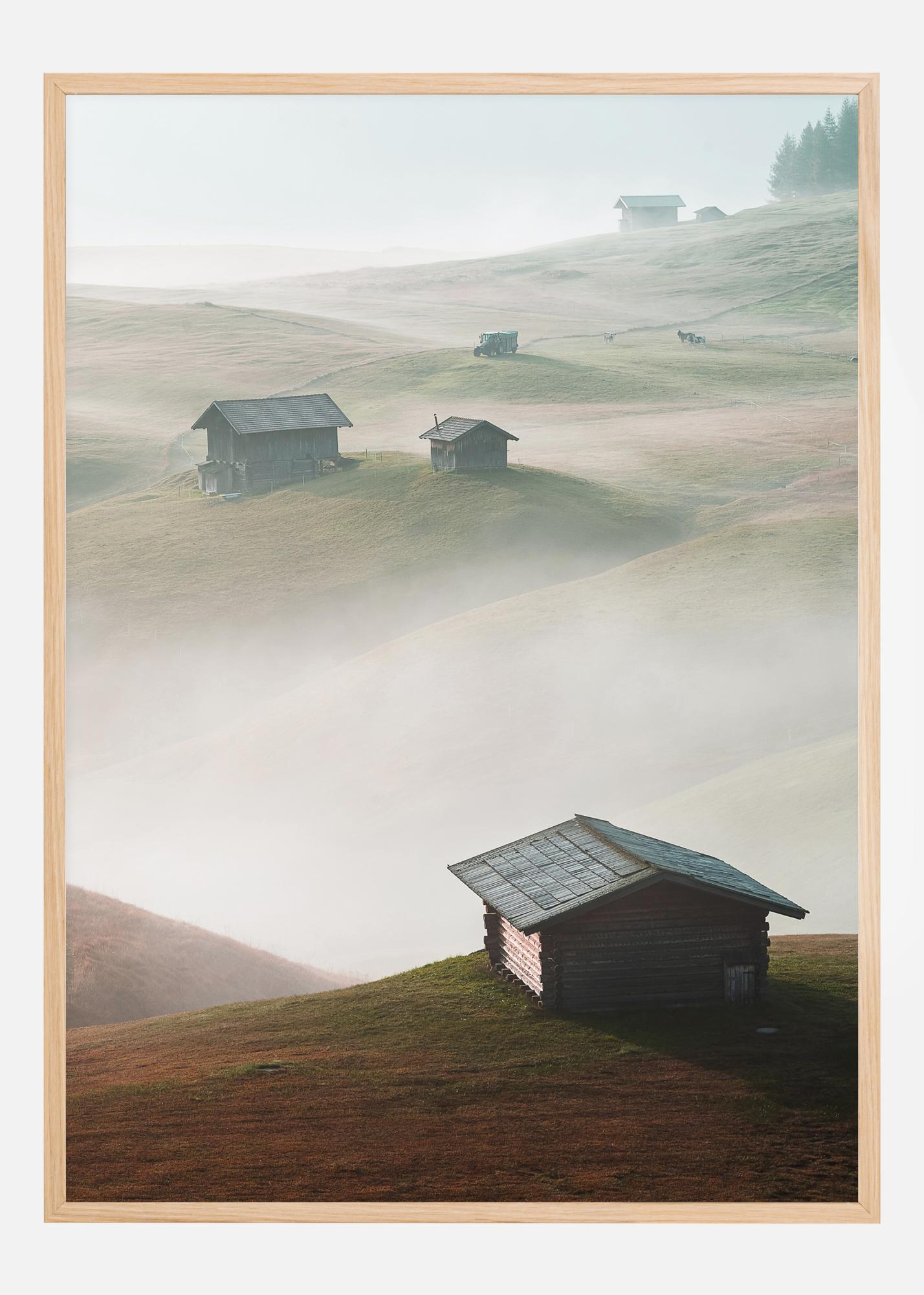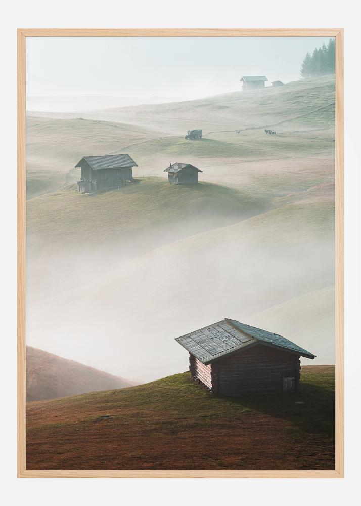 Μια μαγική αφίσα με σπίτια που στέκονται σε λόφους που υψώνονται πάνω από την ομίχλη και τα σύννεφα από κάτω. Κάθε μικρή καλύβα ξεχωρίζει στους κυματιστούς πράσινους λόφους. Η ομίχλη ανάμεσα στα σπίτια τους κάνει να φαίνονται σαν νησιά που τους χωρίζουν μεταξύ τους. Χάσου σε αυτή την απέραντη θέα.