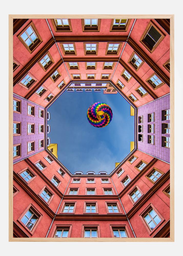 Μια ζωντανή αφίσα σε προοπτική με θέα από βάτραχο μέσα από ροζ κτίρια προς τον γαλάζιο ουρανό. Τα κτίρια σχηματίζουν ένα εξάγωνο όταν κοιτάς προς τα επάνω πέρα από όλα τα παράθυρα. Στο κέντρο του μπλε ουρανού υπάρχει ένα πολύχρωμο ουράνιο μπαλόνι που αιωρείται πάνω από το άνοιγμα. Αφήστε τη φαντασία σας να σας ταξιδέψει με αυτήν την φωτεινή, αισιόδοξη εικόνα.