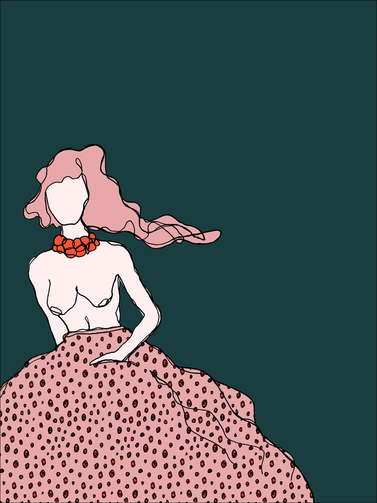 Μια διασκεδαστική αφίσα με ένα κορίτσι σε πράσινο φόντο. Η γυναίκα είναι τόπλες με μια ροζ φούστα με μεγάλες κηλίδες, η οποία κυματίζει. Τα ροζ κόκκινα μαλλιά της φυσούν πλάγια σε έναν αόρατο άνεμο. Φωτεινές πορτοκαλί χάντρες στολίζουν τον λαιμό της. Με το ένα χέρι στην τσέπη, αυτό το σκίτσο μιας γυναίκας σε κίνηση δίνει μια χαλαρή αίσθηση, ιδανική για μια ελαφρώς δροσερή ανάρτηση στον τοίχο.