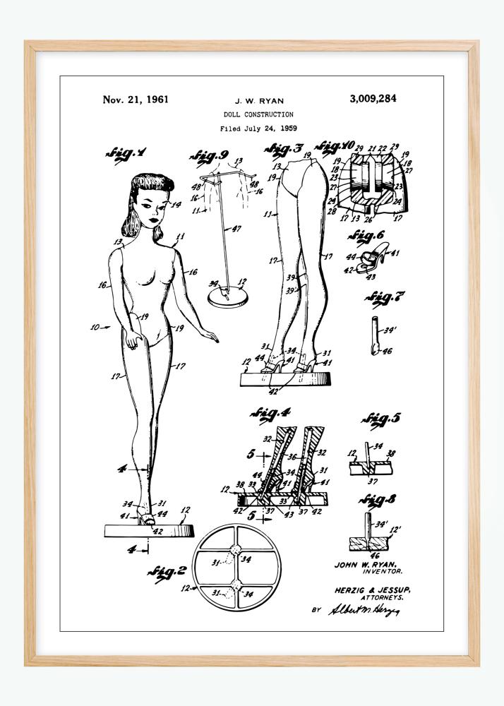 Αυτή η χαρακτηριστική αφίσα πατέντας αποκαλύπτει την κατασκευή μιας κούκλας Barbie, η οποία κατοχυρώθηκε με δίπλωμα ευρεσιτεχνίας στις 21 Νοεμβρίου 1961 με αριθμό 3,009,284. Εφευρέθηκε από τον J.W. Ryan και η αίτηση υποβλήθηκε στις 24 Ιουλίου 1959, το σχέδιο παρουσιάζει τα μοναδικά μέρη και τις συνδέσεις της κούκλας, ένα συναρπαστικό παράδειγμα σχεδίασης παιχνιδιών και καινοτομίας στα μέσα του 20ου αιώνα. Η αφίσα είναι ένα κομμάτι πρώτης τάξεως για συζήτηση που είναι τέλειο για συλλέκτες ή ως διακοσμητικό στοιχείο σε έναν δημιουργικό χώρο.