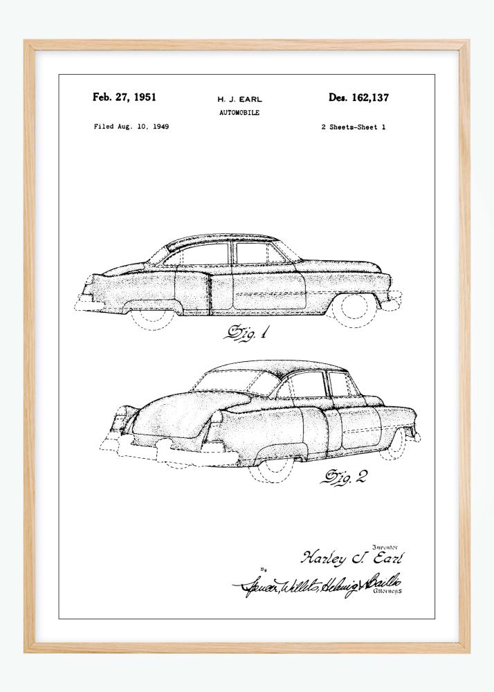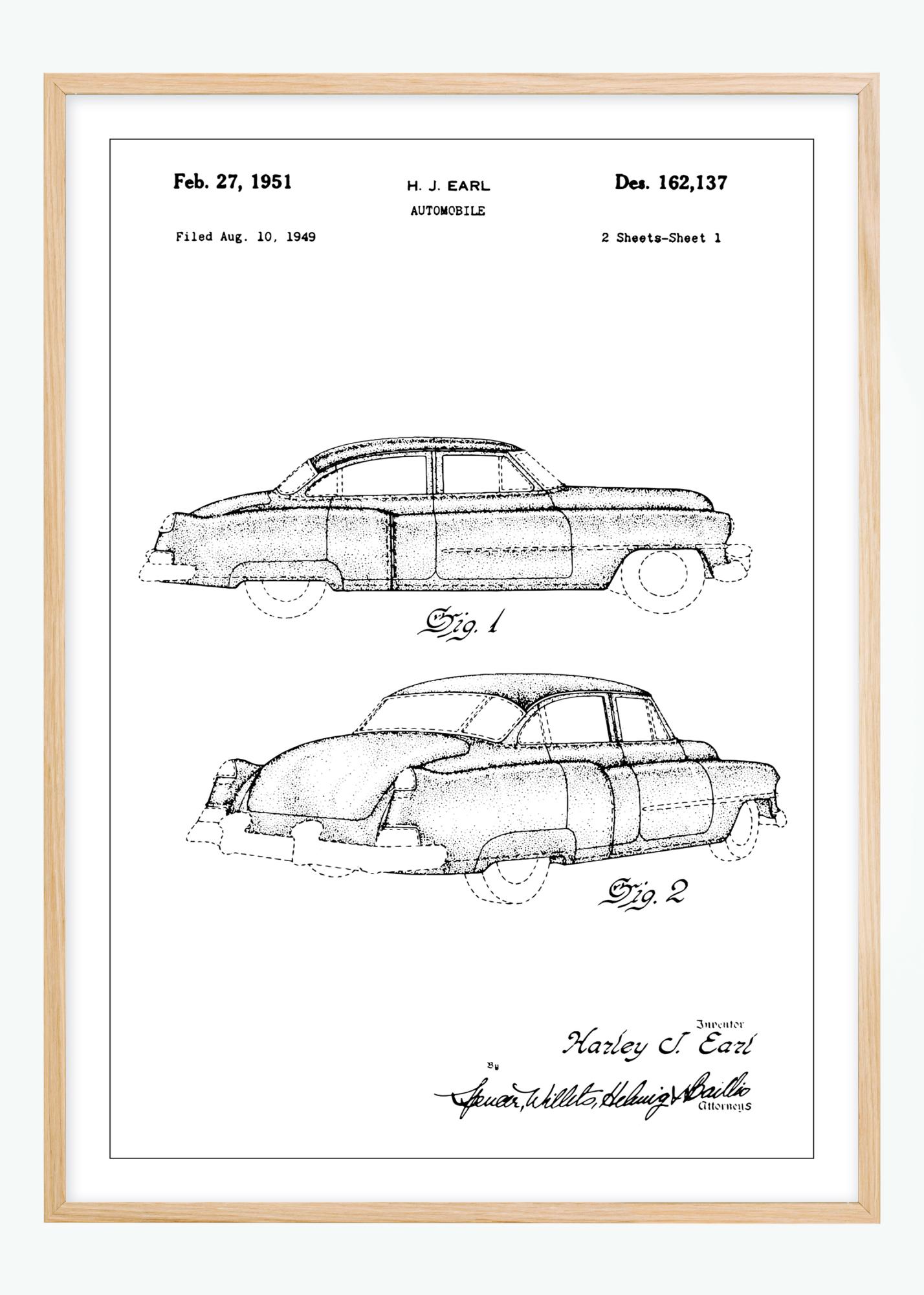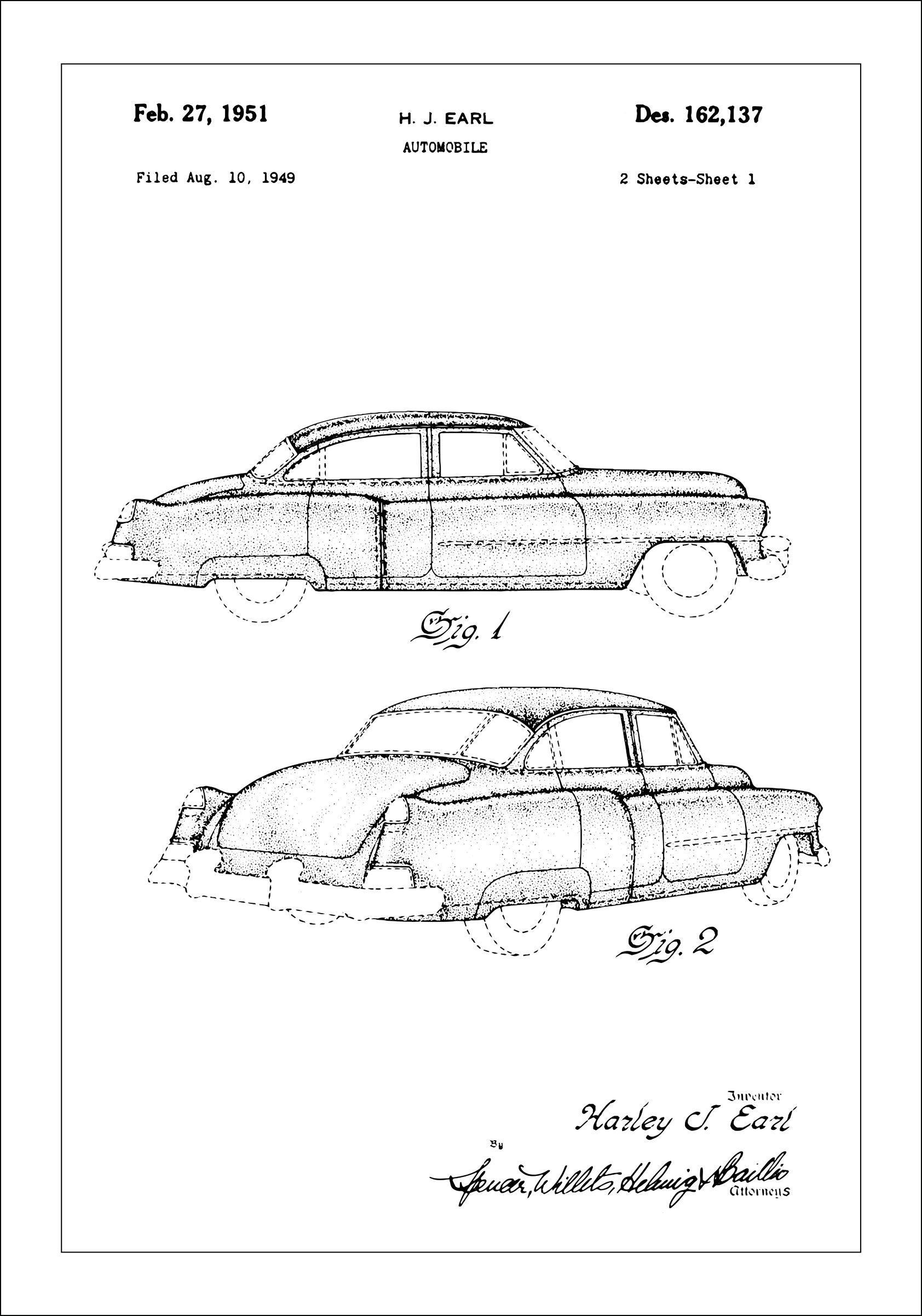 Αυτή η αφίσα με την πατέντα παρουσιάζει ένα εκλεπτυσμένο σχέδιο αυτοκινήτου σε μια Cadillac, σχεδιασμένη από τον διάσημο H.J. Earl. Χρονολογημένη στις 27 Φεβρουαρίου 1951, με αριθμό πατέντας Des. 162,137, η οποία υποβλήθηκε αρχικά στις 10 Αυγούστου 1949, αυτή η εικόνα αποτυπώνει την ουσία της μεταπολεμικής αυτοκινητοβιομηχανίας. Το θέμα αποτελεί φόρο τιμής στην χρυσή εποχή του αμερικανικού αυτοκινήτου και έχει παραχθεί με προσοχή στη λεπτομέρεια που απευθύνεται τόσο στους κατασκευαστές αυτοκινήτων όσο και στους λάτρεις του σχεδιασμού.