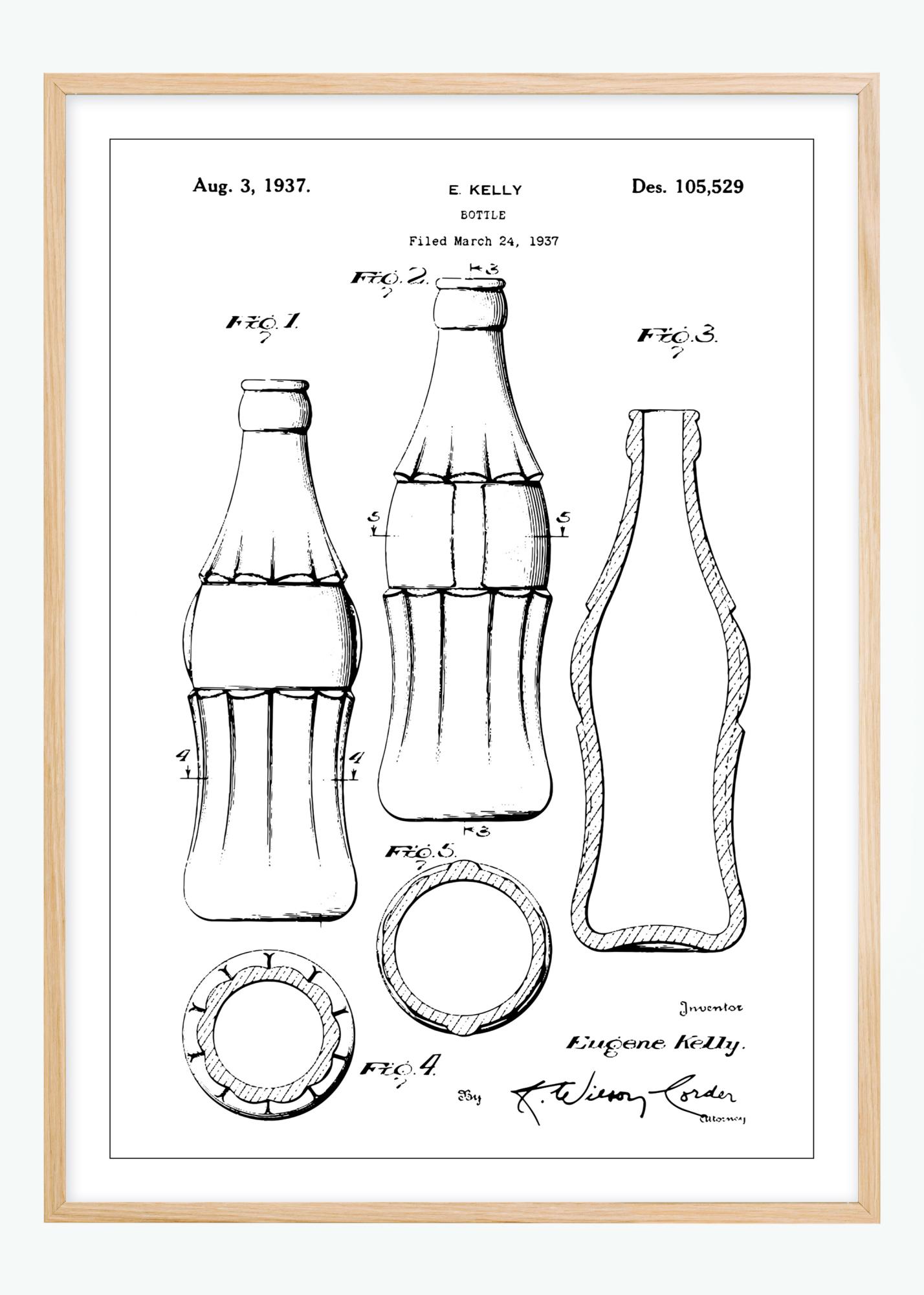 Αυτή η αφίσα ευρεσιτεχνίας δείχνει το σχέδιο ενός μπουκαλιού Coca-Cola, που χορηγήθηκε στον E. Kelly στις 3 Αυγούστου 1937 με αριθμό διπλώματος ευρεσιτεχνίας Des. 105,529. Η εικονογράφηση δείχνει τις λεπτομερείς περιγράμματα και τις αναλογίες του μπουκαλιού από πολλές γωνίες, παρέχοντας μια πλήρη εικόνα του σχεδίου. Η εμβληματική μορφή του μπουκαλιού έχει γίνει συνώνυμη με το προϊόν που περιέχει και είναι μια διαχρονική αναπαράσταση της επωνυμίας και του σχεδιασμού προϊόντων.