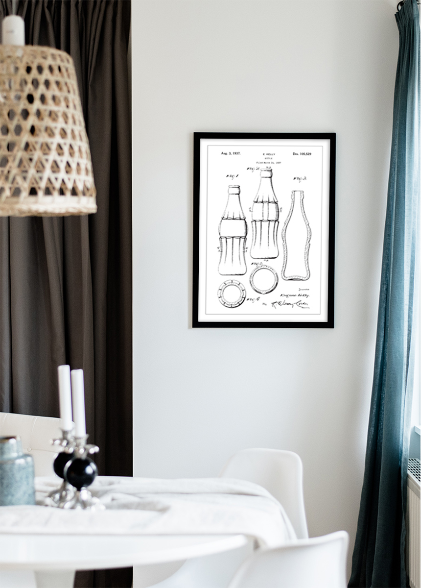 Το σχέδιο ευρεσιτεχνίας αυτού του μπουκαλιού είναι ένα ελκυστικό διακοσμητικό κομμάτι που θα ταιριάζει καλά σε σύγχρονα μπαρ και κουζίνες στο σπίτι, ή ως έμπνευση σε στούντιο σχεδίασης. Λέξεις-κλειδιά για να βρείτε αυτόν τον τύπο αφίσας ευρεσιτεχνίας θα περιλάμβαναν 'ευρεσιτεχνία μπουκαλιού', 'αφίσα παλαιού μπουκαλιού' και 'κλασικό σχέδιο συσκευασίας', βοηθώντας τους συλλέκτες και τους λάτρεις του σχεδιασμού να ανακαλύψουν αυτό το κομμάτι της βιομηχανικής ιστορίας.