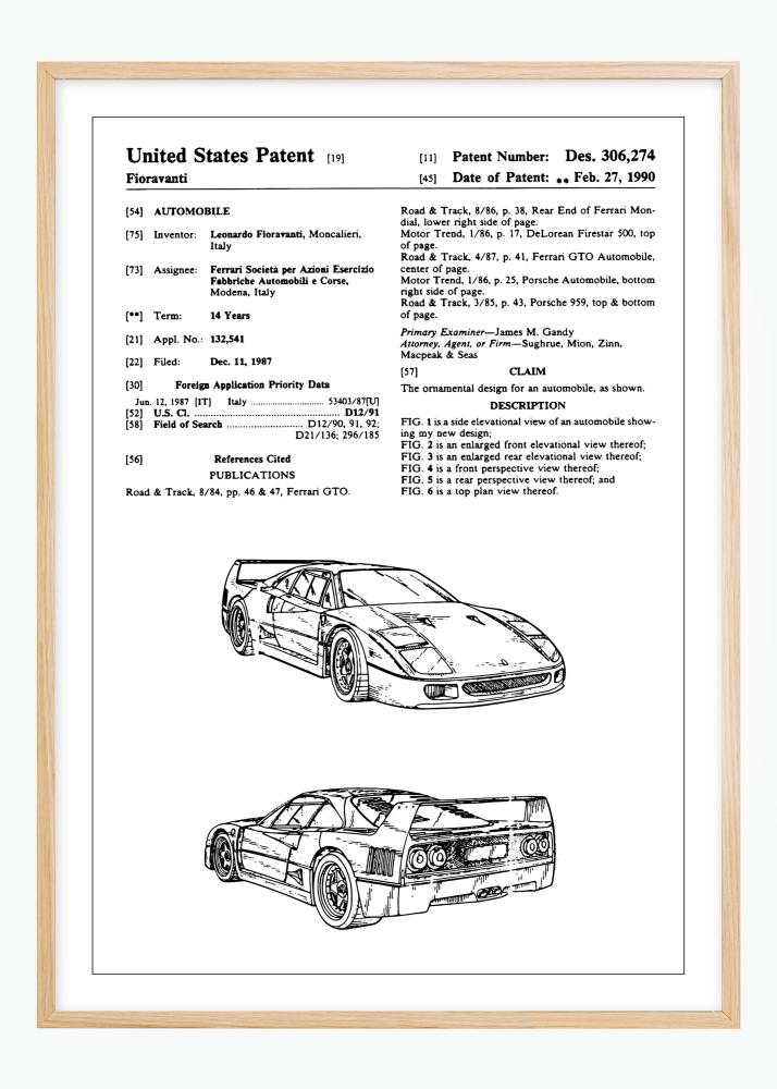 Αυτή η κομψή αφίσα διπλώματος ευρεσιτεχνίας παρουσιάζει ένα σχέδιο αυτοκινήτου από τον Leonardo Fioravanti για τη Ferrari, ένα από τα πιο εμβληματικά ονόματα στη βιομηχανία αυτοκινήτων. Εγκρίθηκε στις 27 Φεβρουαρίου 1990 με αριθμό διπλώματος ευρεσιτεχνίας Des. 306,274, το έγγραφο αντιπροσωπεύει τον αισθητικό σχεδιασμό μιας Ferrari F40 που αιχμαλωτίζει την ουσία της ταχύτητας και της καινοτομίας. Οι εικονογραφήσεις του διπλώματος ευρεσιτεχνίας τονίζουν τις εντυπωσιακές γραμμές και τη αεροδυναμική σιλουέτα που έχουν καθορίσει το εμπορικό σήμα.