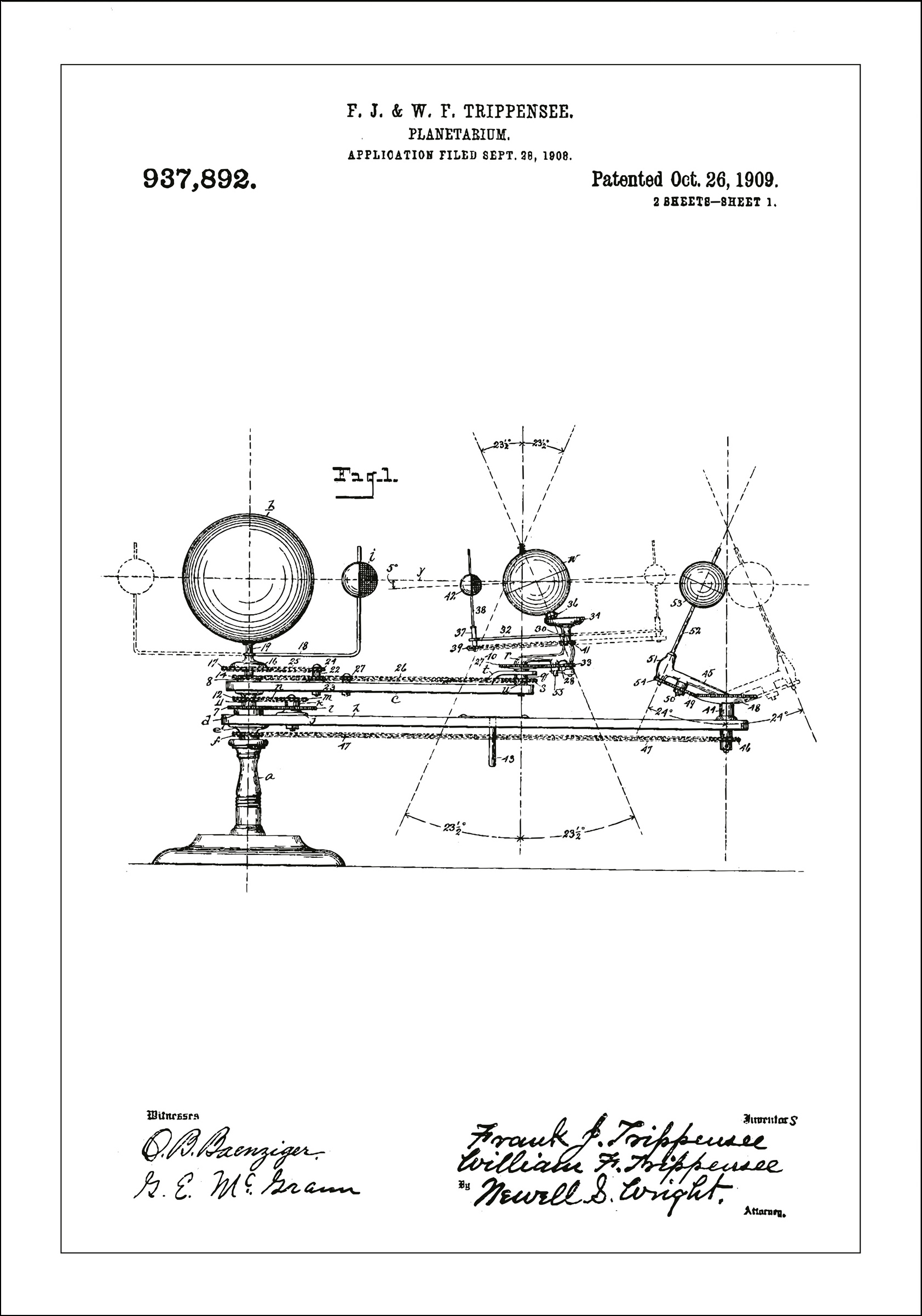 Αυτή η κομψή αφίσα ευρεσιτεχνίας είναι ένας φόρος τιμής στην μηχανική και τη μελέτη των ουράνιων σωμάτων, με μια λεπτομερή απεικόνιση του πλανηταρίου των F. J. & W. F. Trippensee, μια κλασική εφεύρεση από τις αρχές του 20ού αιώνα. Το δίπλωμα ευρεσιτεχνίας, αριθμός 937.892, καταχωρήθηκε στις 26 Οκτωβρίου 1909 και η αίτηση έγινε στις 28 Σεπτεμβρίου 1908. Αυτό το καλλιτεχνικά απεικονισμένο έγγραφο ευρεσιτεχνίας είναι μια μοναδική λεπτομέρεια διακόσμησης που προσφέρει τόσο ένα μάθημα ιστορίας όσο και έναν τρόπο έναρξης συζητήσεων. Είναι ιδανική για τους λάτρεις της επιστήμης ή για να δώσει μια ακαδημαϊκή αίσθηση στο σπίτι, το γραφείο ή την τάξη.