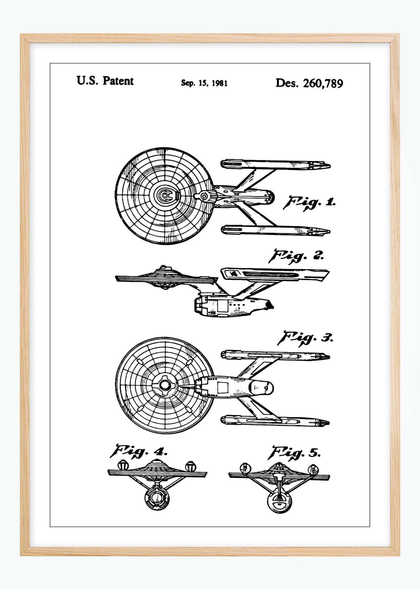 Αυτή η αφίσα ευρεσιτεχνίας δείχνει ένα λεπτομερές σχέδιο του Enterprise από το StarTrek, το οποίο χορηγήθηκε ως ευρεσιτεχνία στις 15 Σεπτεμβρίου 1981 με αριθμό Des. 260,789. Οι πέντε φιγούρες απεικονίζουν τον ανεμιστήρα από διάφορες γωνίες, παρέχοντας μια ολοκληρωμένη άποψη της κατασκευής και του σχεδιασμού του. Τα σχέδια αναδεικνύουν την τεχνική δομή και την αισθητική υλοποίηση αυτής της οικιακής συσκευής.
