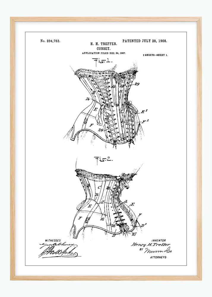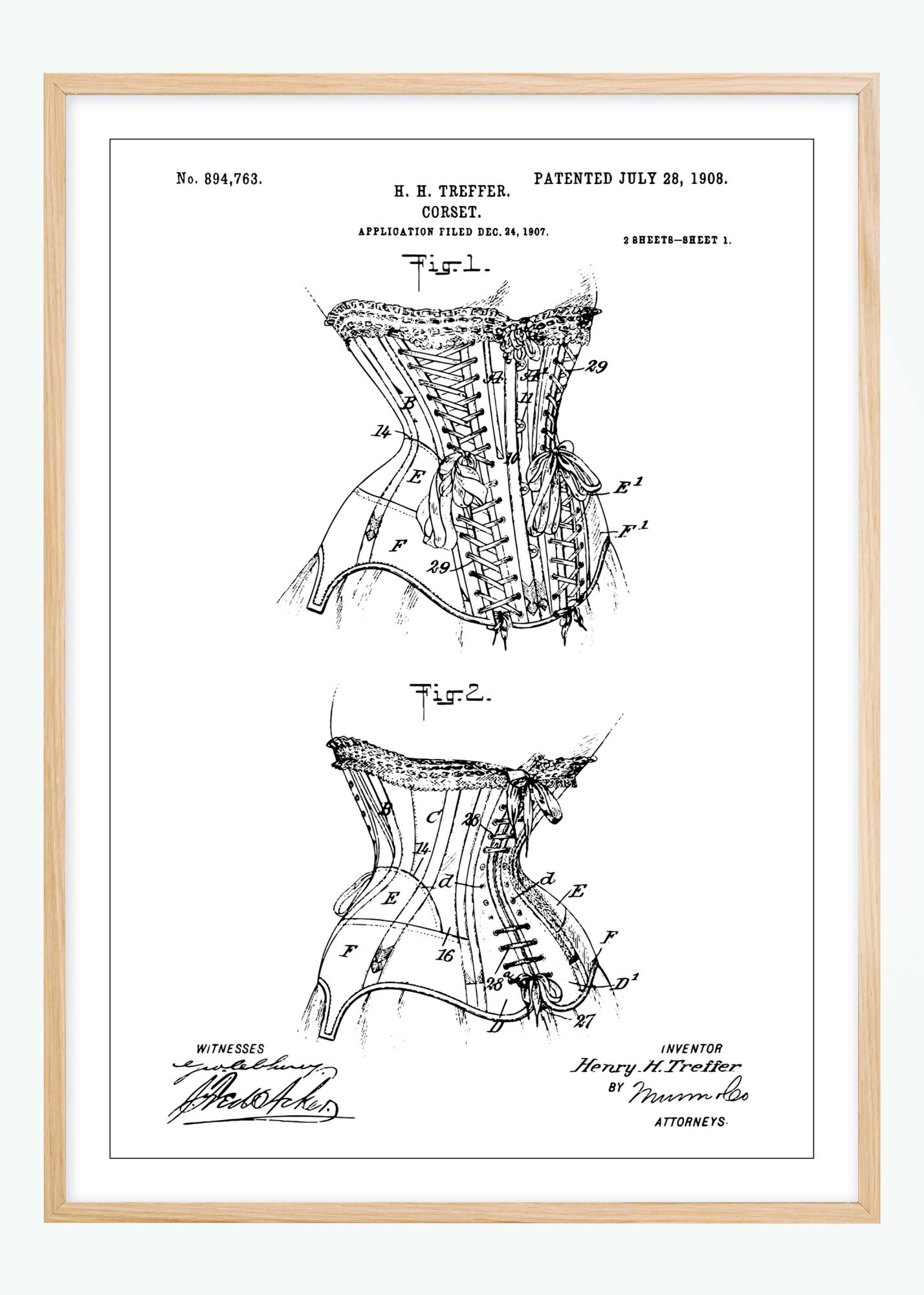 Αυτή η αφίσα πατέντας απεικονίζει ένα σχέδιο ενός κορσέ, μια καινοτομία στο σχεδιασμό μόδας που πατεντάρει ο Henry H. Treffer στις 28 Ιουλίου 1908, με αριθμό πατέντας 894,763. Οι εικονογραφήσεις δείχνουν τη λεπτομερή διαμόρφωση του κορσέ με τη δαντέλα και τη δομή του, τονίζοντας τη δημιουργία ρούχων της εποχής και την έμφαση στη σιλουέτα και τη μορφή.