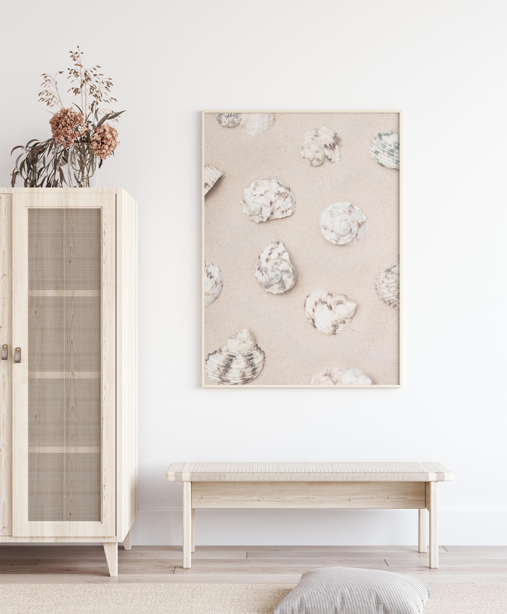 Μια αφίσα σε παστέλ χρώματα με κοχύλια πάνω σε ανοιχτό ροζ φόντο. Δώδεκα στριμμένα κοχύλια βρίσκονται σε διαφορετικές θέσεις, ομοιόμορφα κατανεμημένα σε όλη την εικόνα. Κάθε κοχύλι είναι λευκό και καφέ, δημιουργώντας μια πολύ απαλή εικόνα που είναι ιδανική ως επιπλέον μοτίβο σε έναν συνηθισμένο τοίχο.