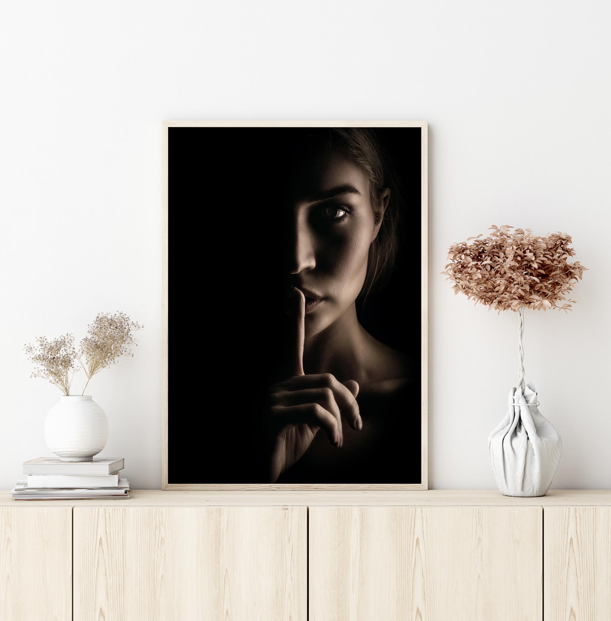 Μία μυστηριώδης αφίσα πορτρέτου με το πρόσωπο μιας γυναίκας μισοκρυμμένο στη σκιά. Ένα δάχτυλο υψώνεται στα χείλη της για να σε κρατήσει σιωπηλό ενώ σε κοιτάζει κατευθείαν στα μάτια. Ο δραματικός φωτισμός δημιουργεί ένα απαλό φως στη μία πλευρά, ενώ στη άλλη πέφτει στη σκιά.