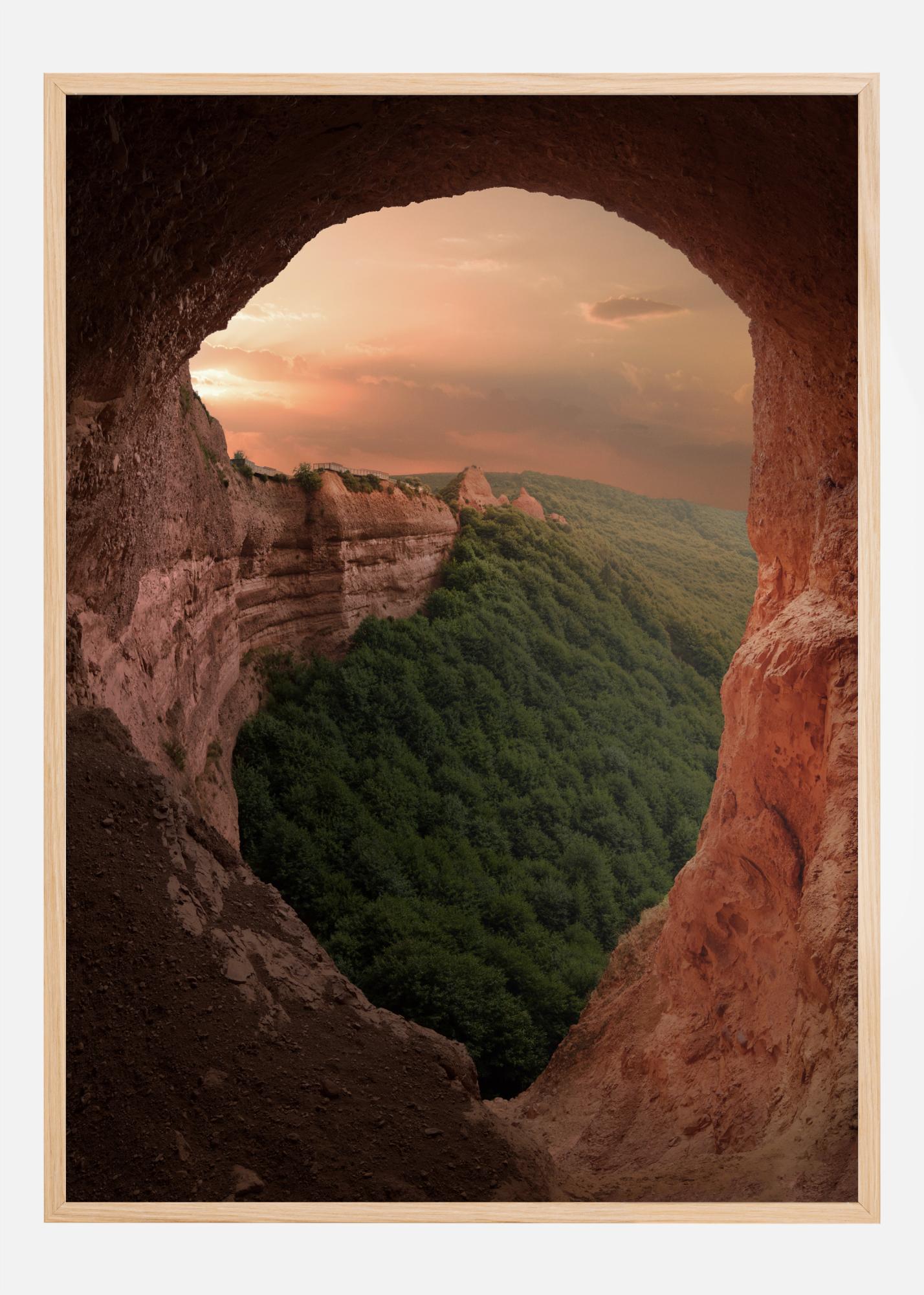 Μια εντυπωσιακή αφίσα με ένα δραματικό κόκκινο τοπίο. Κοιτάξτε μέσα από το άνοιγμα στον βράχο για να δείτε τους κόκκινους βράχους που εκτείνονται μακριά πέρα. Τα αναπτυσσόμενα πράσινα δέντρα αποτελούν την τέλεια αντίθεση καθώς ο ήλιος δύει και ρίχνει μια ζεστή λάμψη σε όλα. Επισκεφτείτε αυτό το μέρος από το σπίτι.