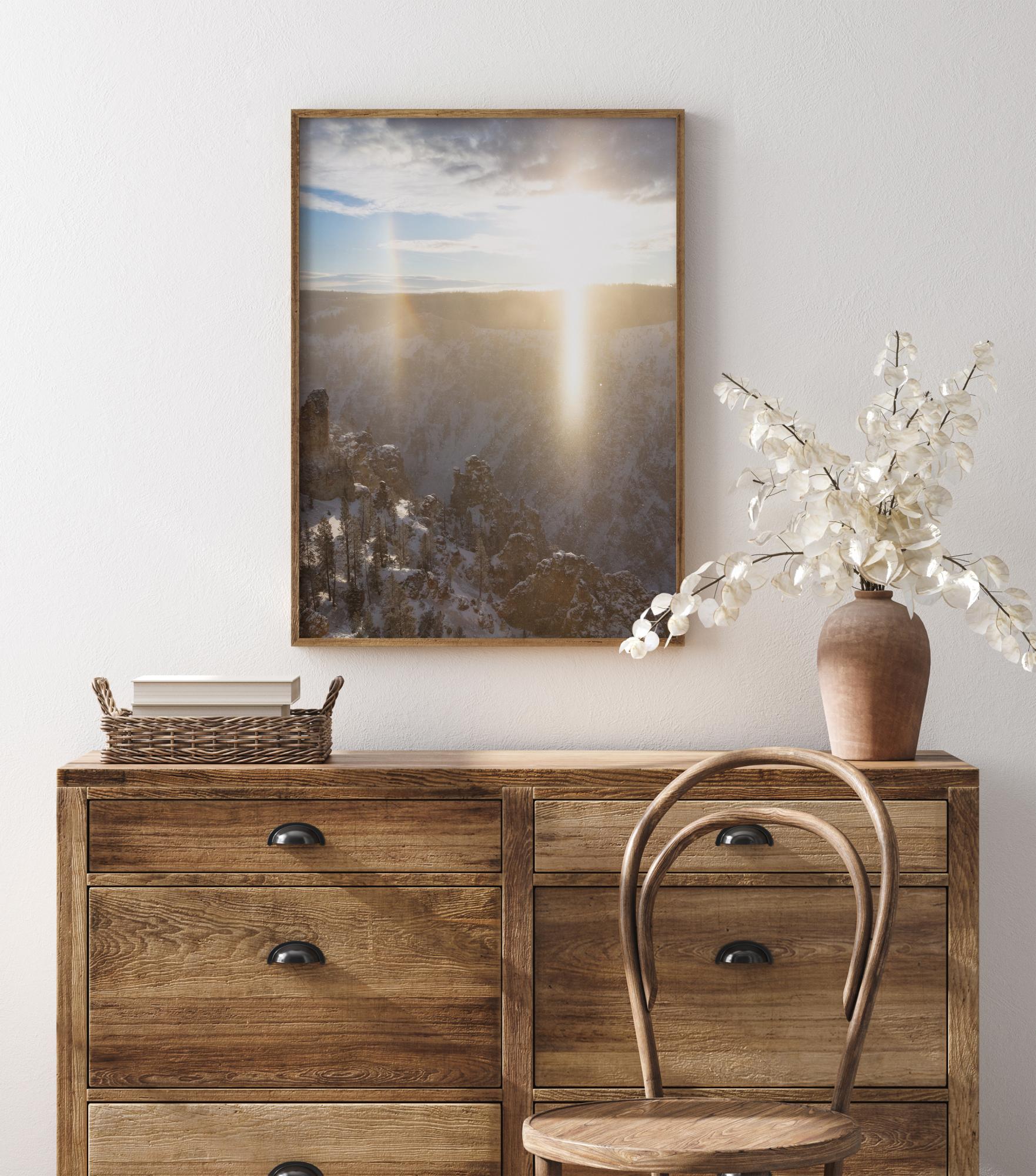 Μια γραφική αφίσα με χιονισμένες βουνοκορφές. Ο ήλιος βρίσκεται ψηλά στον ουρανό και λάμπει έντονα πάνω από τα βουνά, δημιουργώντας μια ισχυρή λάμψη με ανταύγειες πάνω στους βράχους. Τα σύννεφα κυλούν στον ουρανό καθώς ο ήλιος χτυπά τις χιονισμένες κορυφές, προσφέροντας μια δραματική, αλλά και ήρεμη χειμωνιάτικη εικόνα.