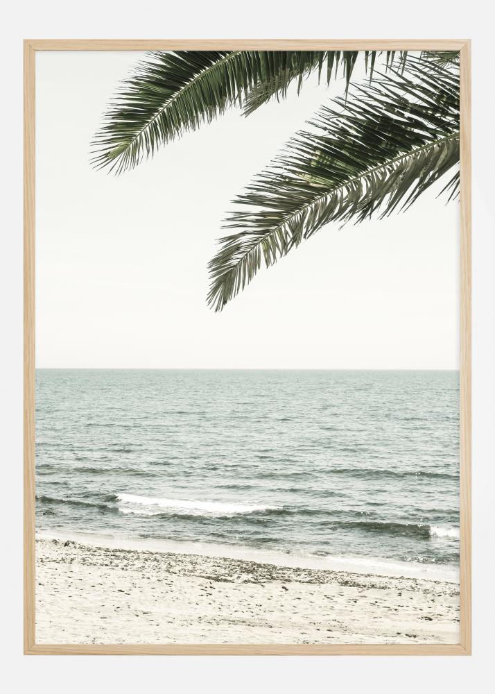 Νιώστε την ήρεμη ατμόσφαιρα μιας τροπικής απόδρασης με αυτήν την αφίσα που αποτυπώνει θέα από λικνιζόμενα φύλλα φοινίκων σε έναν γαλανό ουρανό και τη γαλήνια θάλασσα. Η χαλαρωτική σκηνή της παραλίας πλαισιώνεται από τα ζωντανά πράσινα φύλλα, δημιουργώντας ένα φυσικό παράθυρο που προσκαλεί τον παρατηρητή να ονειρευτεί θερμά γεωγραφικά πλάτη.