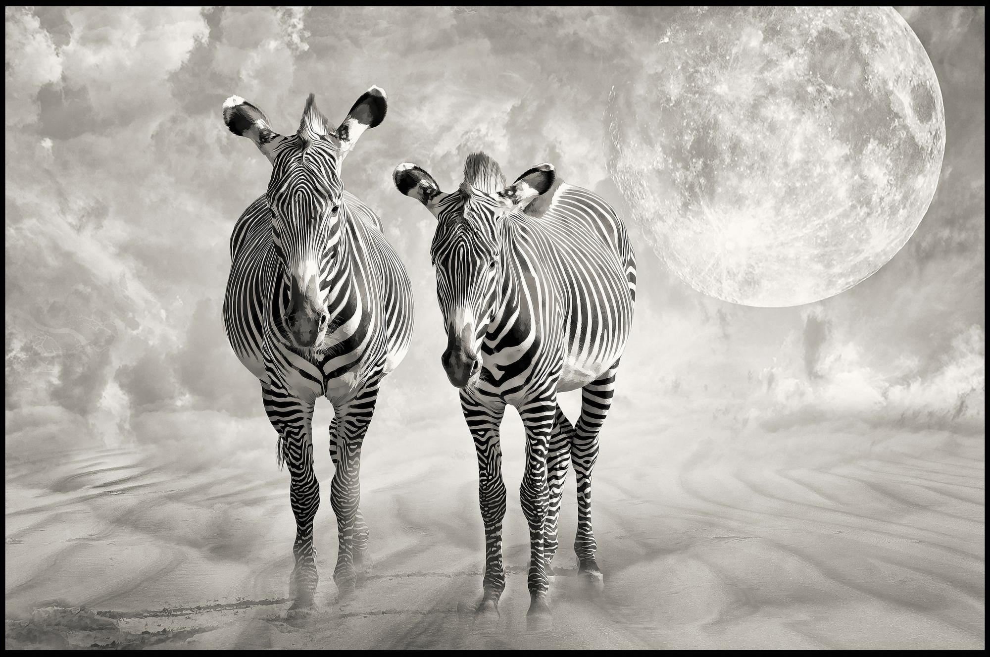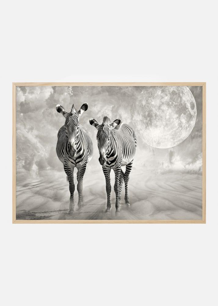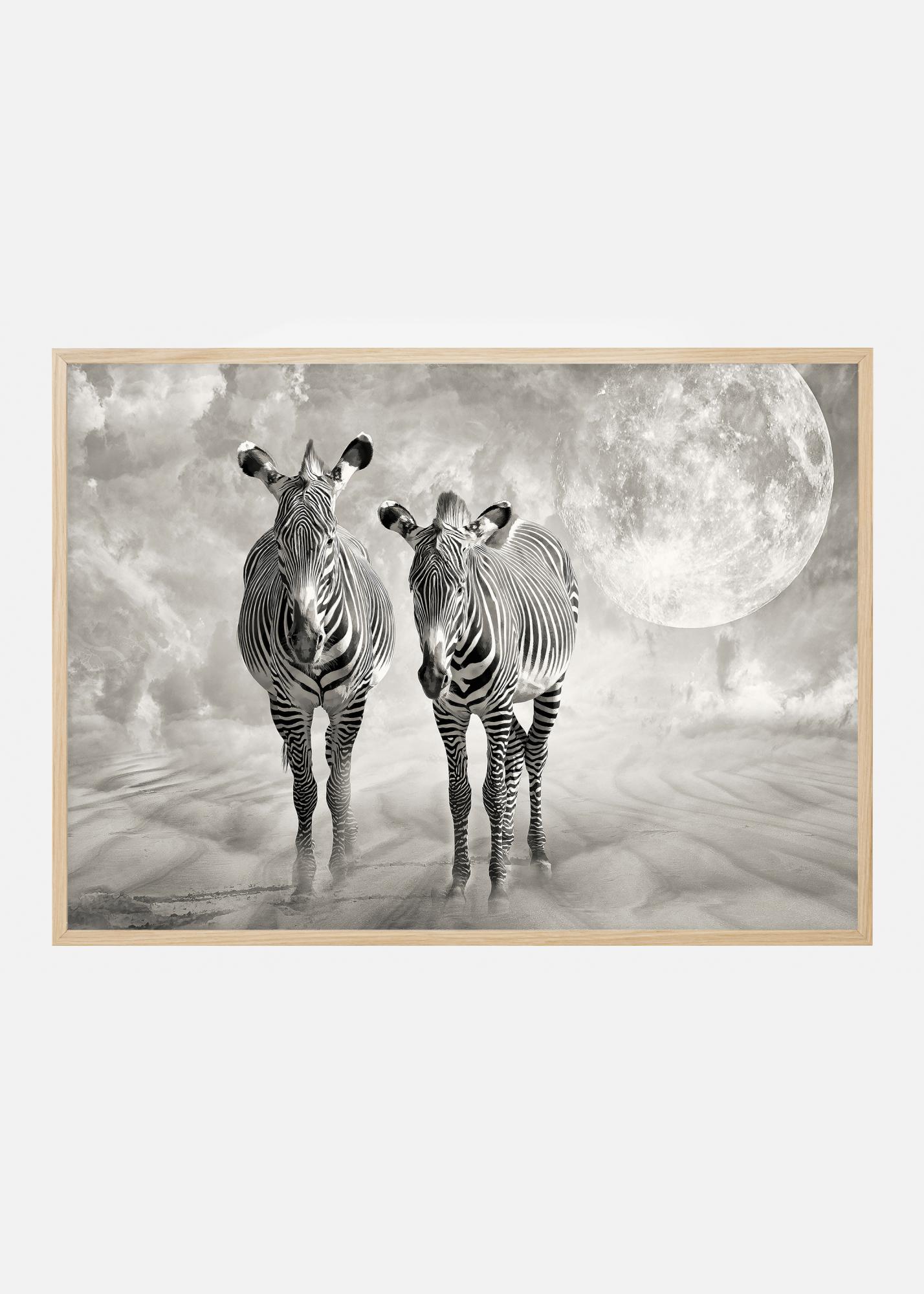 Μια αφίσα φαντασίας με δύο ζέβρες που περπατούν μαζί με απαλή κυματιστή σκόνη και μια μεγάλη πανσέληνο πίσω. Η εικόνα είναι απαλή μαύρη, λευκή και ασημένια και δημιουργεί μια μαγική αίσθηση σαν να ρίχνει το φως του το φεγγάρι πάνω σε αυτούς τους συγγενικούς πνεύματα. Νιώστε το θαύμα σε αυτό το αιθέριο τύπωμα.