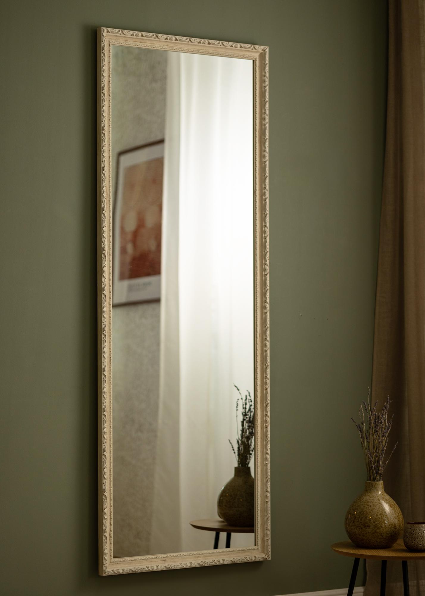 Λευκός καθρέφτης σε αντικέ στυλ με ορατά νερά ξύλου και πλάτος 40 mm. Μια εξαιρετική επιλογή όταν αναζητάτε έναν καθρέφτη που ξεχωρίζει και καταλαμβάνει χώρο.