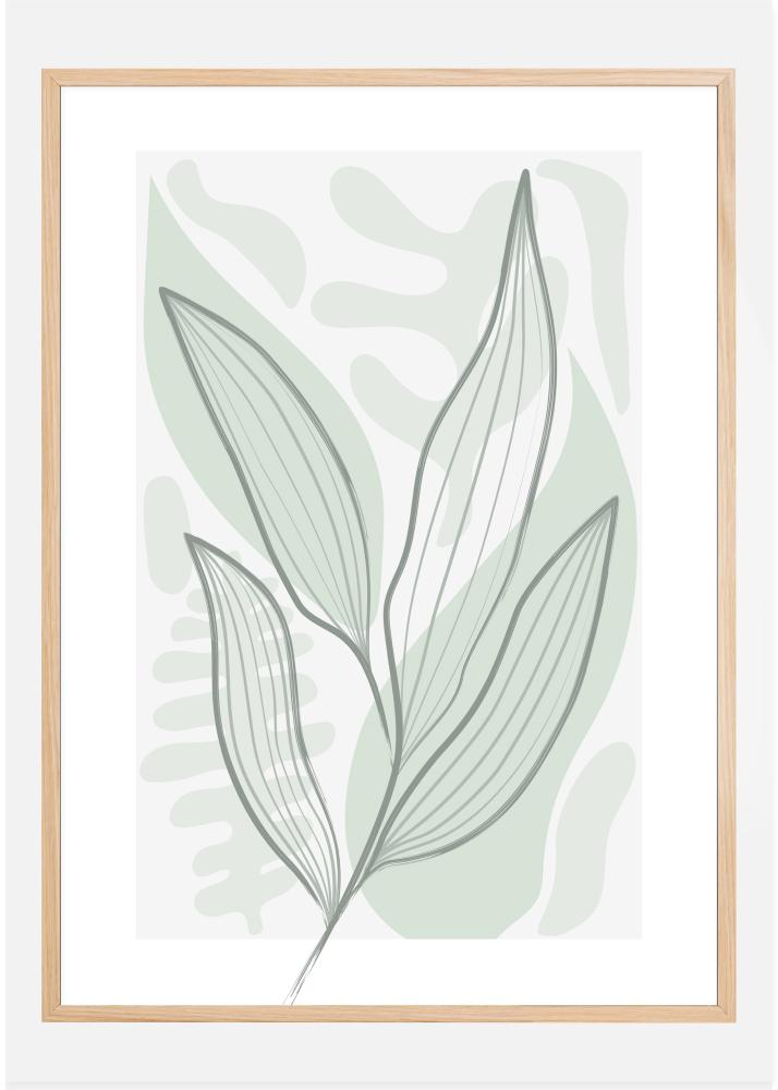 Μια αφηρημένη αφίσα με φύλλα σε απλό πράσινο φόντο με διάφορα σχήματα και μοτίβα φύλλων. Με απαλές πράσινες και γκρι αποχρώσεις, η απλή σχεδίαση των φύλλων, που περιγράφεται από μια έντονη γκρι γραμμή, προσφέρει μια έντονη αλλά απαλή αίσθηση άνοιξης που μπορεί να κρεμαστεί σε οποιοδήποτε δωμάτιο του σπιτιού.
