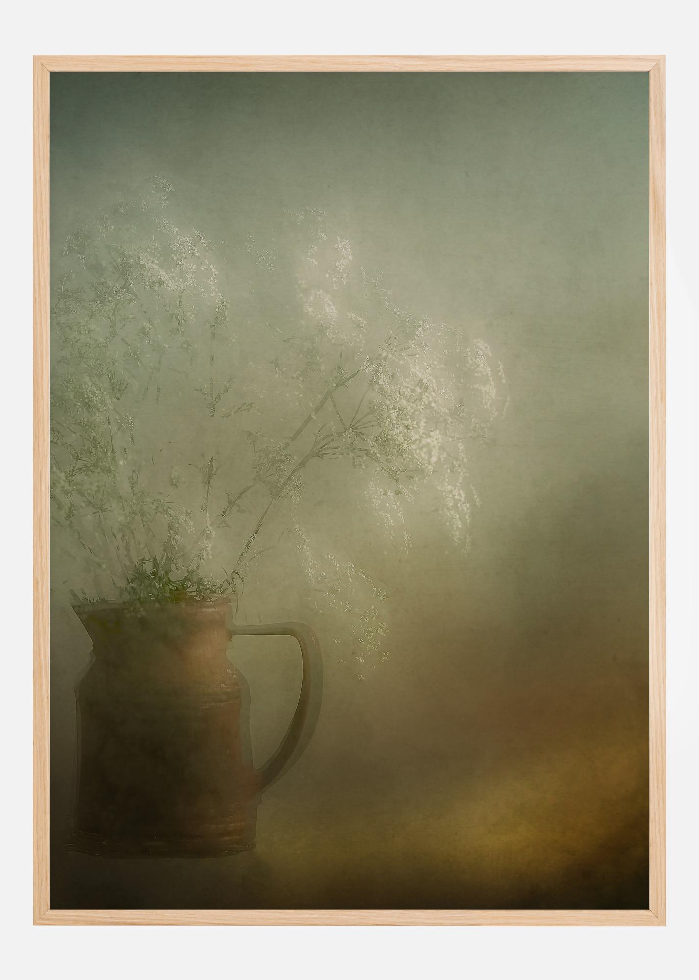 Ένα ζωγραφισμένο νεκρή φύση αφίσας με μια καφέ πήλινη κανάτα γεμάτη με απαλά ρευστά λευκά λουλούδια. Αυτό το ανοιξιάτικο μπουκέτο είναι σαν σύννεφο στη φύση του και σχεδόν εξαφανίζεται προς τον απαλό γκρι τοίχο πίσω. Ένα πορτοκαλί φως προσφέρει ζεστασιά στη βάση της εικόνας όπου βρίσκεται η κανάτα.