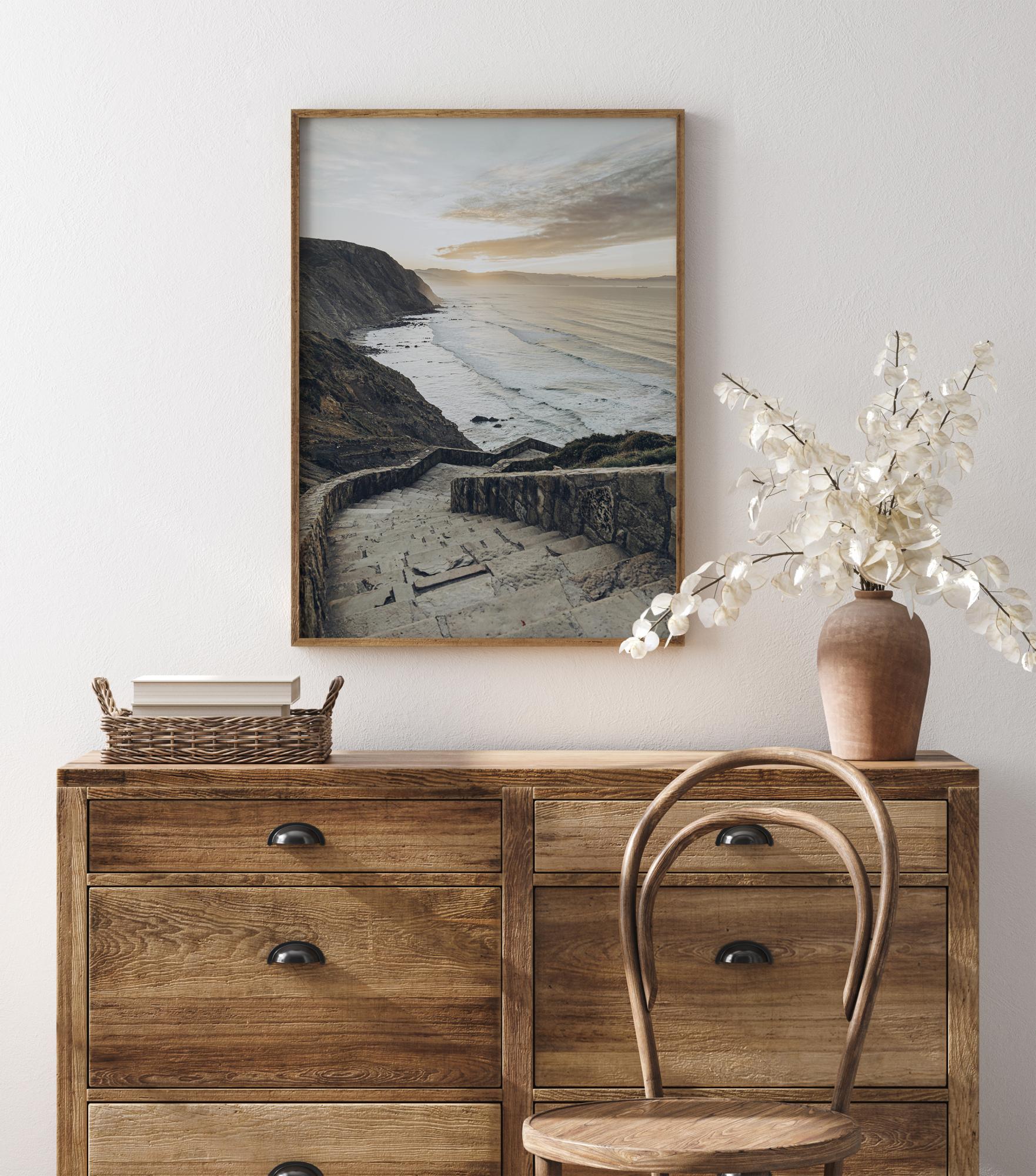 Μια υπέροχη αφίσα τοπίου με ευρυγώνια θέα στη θάλασσα και μια παραλία. Μεγάλες πέτρινες σκάλες οδηγούν κάτω από τον βράχο προς την παραλία που αντικατοπτρίζει το σχήμα του ακρωτηρίου στο βάθος. Τα κύματα χτυπούν στην πετρώδη παραλία σε αυτή τη μαλακή παστέλ εικόνα.