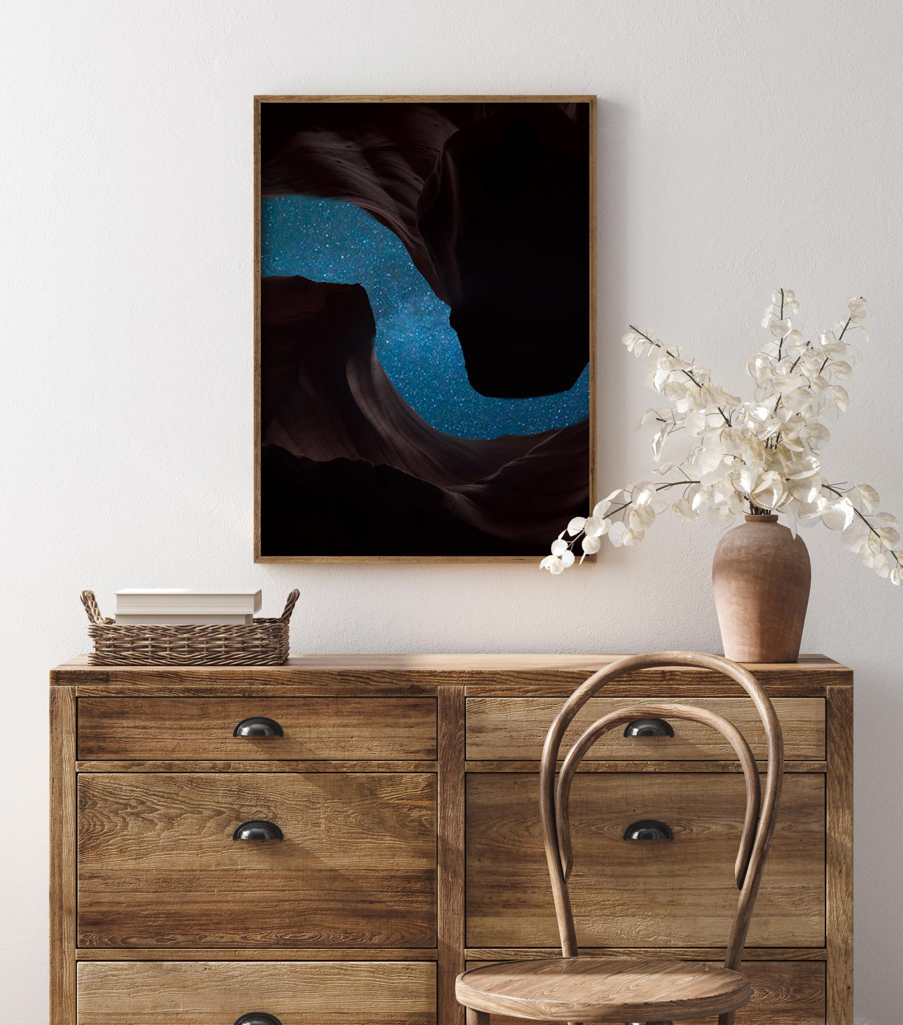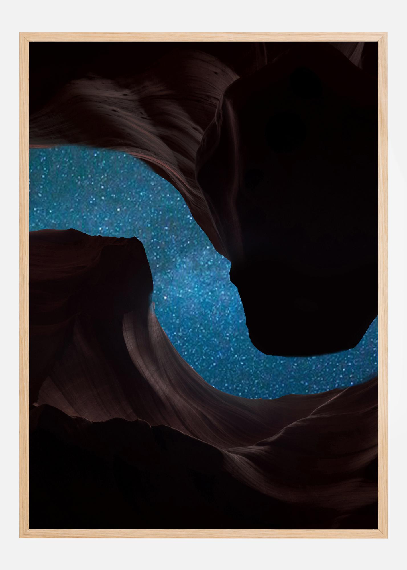 Μια μεγαλοπρεπής νυχτερινή αφίσα με έναν έναστρο ουρανό που φαίνεται ανάμεσα από μερικούς δραματικούς σχηματισμούς βράχων. Τα βαθυκόκκινα βράχια στριφογυρίζουν γύρω από την κορυφή και τον πάτο της φωτογραφίας, δημιουργώντας έναν έναστρο δρόμο για τον νυχτερινό ουρανό να λάμπει μέσα από αυτήν τη ζωντανή εικόνα που έχει δημιουργηθεί για να προκαλέσει δέος.
