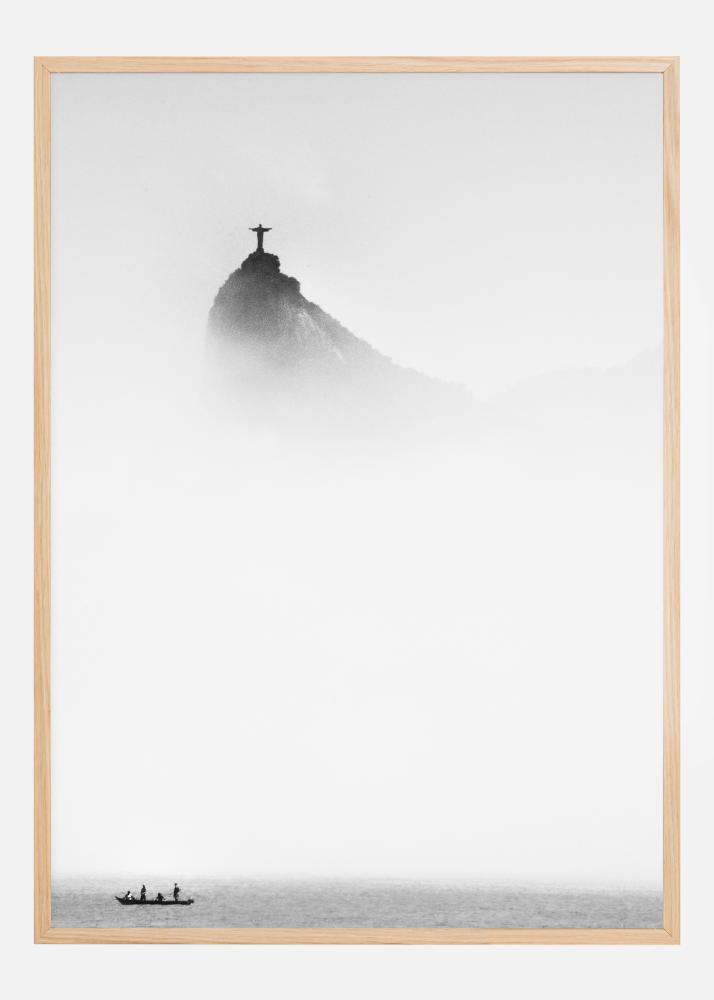 Μια θρησκευτική αφίσα με το άγαλμα του Ιησού στην κορυφή ενός ψηλού βράχου. Μια πνευματική αίσθηση περιβάλλει αυτή την εικόνα ενώ ένα μικρό πλοίο επιπλέει μακριά κάτω από το υψηλό σημείο. Λευκή ομίχλη γεμίζει την εικόνα και αφήνει τον σταυρό να αναδυθεί από τα σύννεφα με θριαμβευτικό τρόπο.