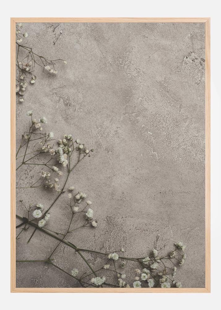 Μια φυσική αφίσα με άνθιζοντα φυτικούς μίσχους που είναι απλωμένοι σε ένα πέτρινο πάτωμα. Τα απαλά λευκά λουλούδια και οι πιο σκοτεινοί διακλαδισμένοι μίσχοι τους ταιριάζουν με τα μοτίβα στο δομημένο ανοιχτό γκρι πάτωμα. Ένας συνδυασμός μαλακών και σκληρών στοιχείων μπορεί να φανεί εδώ, δημιουργώντας αυτή την συναρπαστική εικόνα.