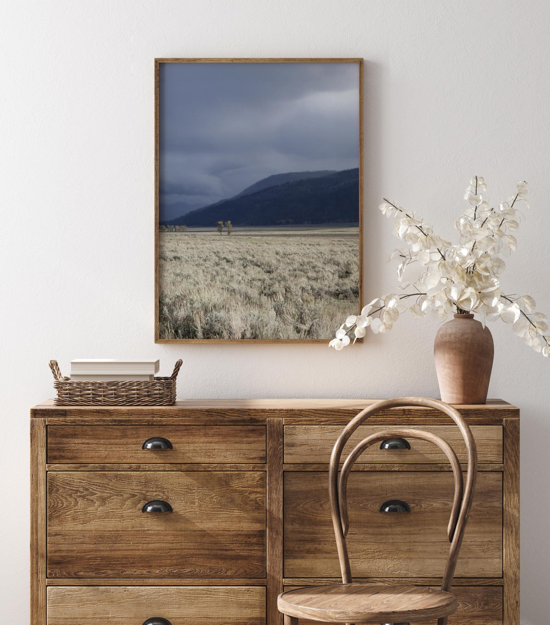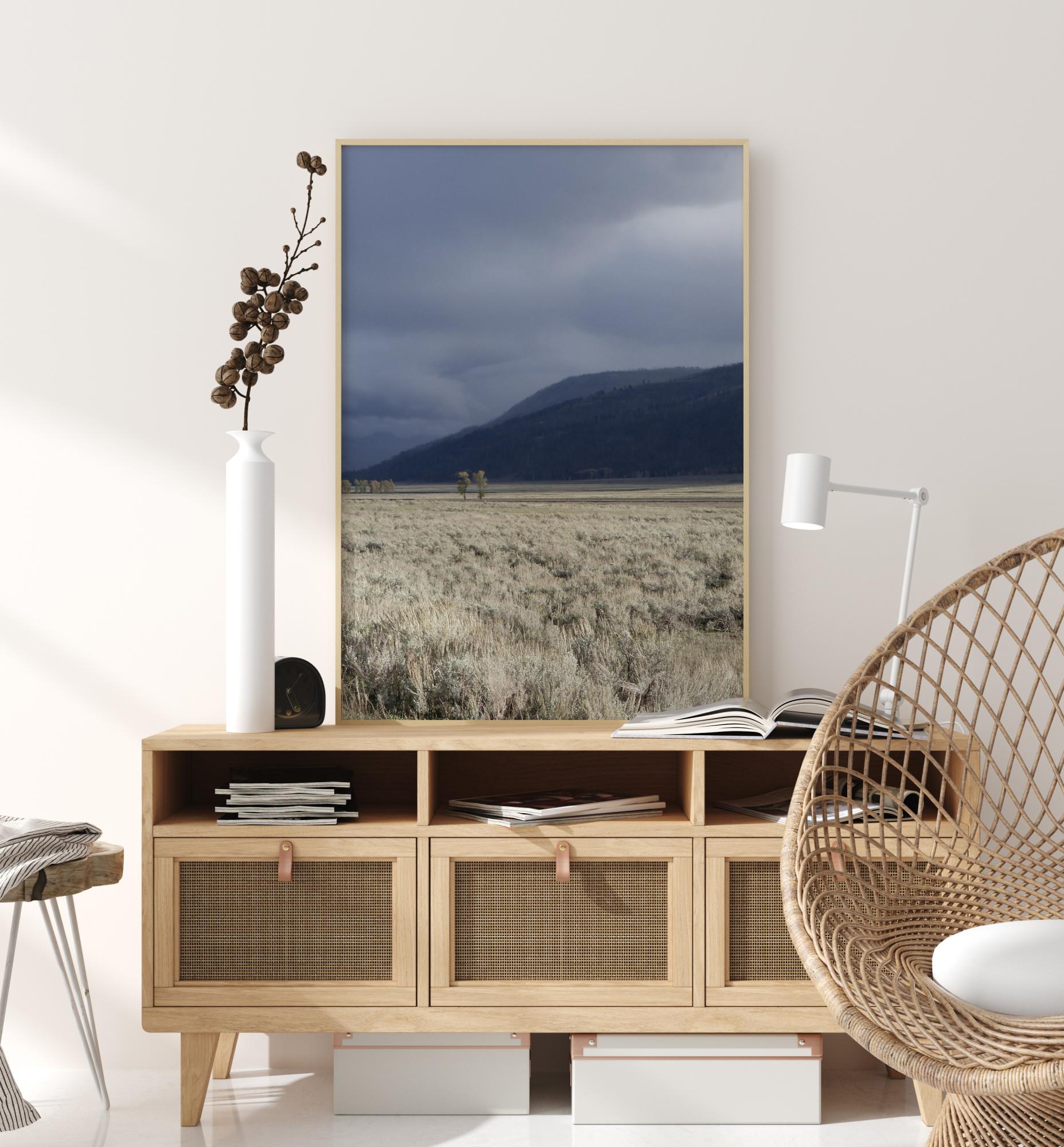 Μια δυσοίωνη αφίσα με μια επικείμενη καταιγίδα πάνω από ένα λευκό χωράφι με γρασίδι. Σκοτεινά σύννεφα συγκεντρώνονται μακριά πάνω από γαλάζια βουνά. Το λευκό χωράφι λάμπει έντονα ενάντια στα εισερχόμενα σκοτεινά σύννεφα που σύντομα θα χτυπήσουν. Η πίεση αυξάνεται καθώς τα σύννεφα κυλούν σε αυτήν τη δραματική σκηνή.