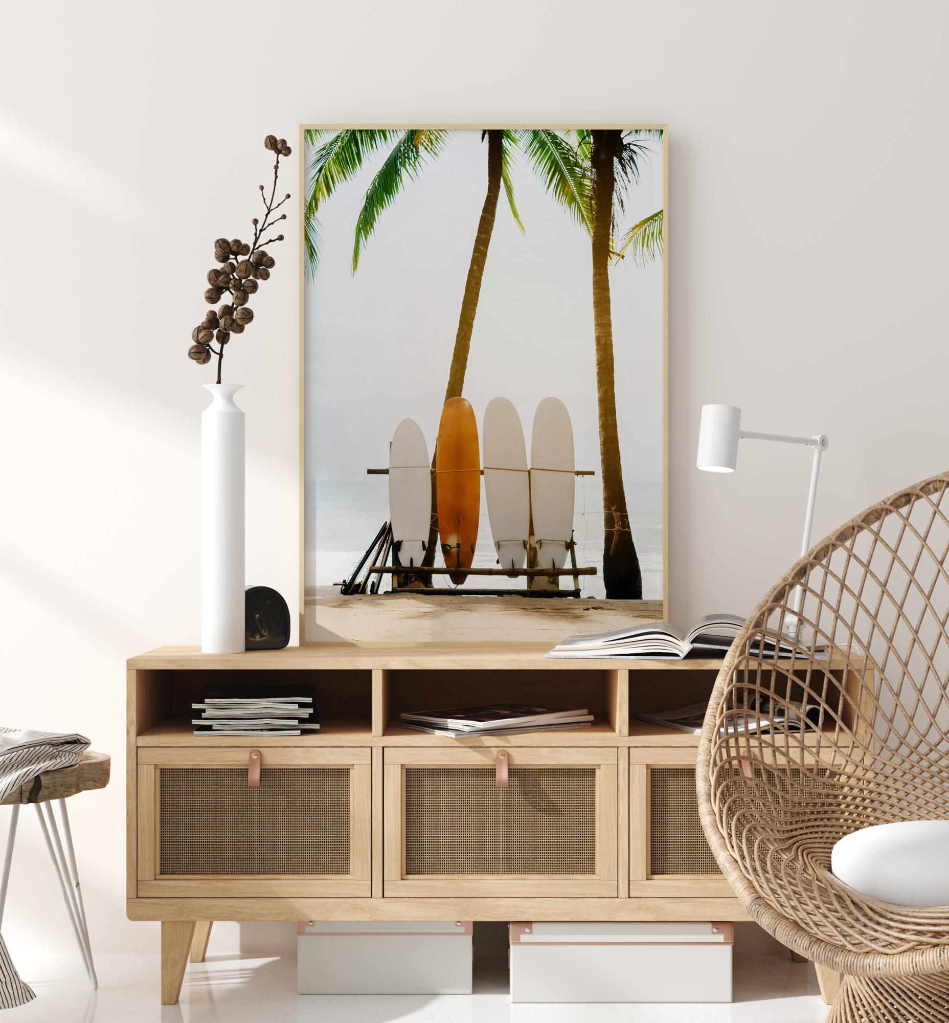 Μια καλοκαιρινή αφίσα που προκαλεί ευχάριστα συναισθήματα με σανίδες του σερφ, φοίνικες και λευκή άμμο. Ένα υπέροχο εξωτικό μοτίβο σε ωραία χρώματα και κομψές αντιθέσεις. Συνδυάστε το προαιρετικά με άλλα από τα υπέροχα μοτίβα μας για έναν μεγαλύτερο, πιο ζωντανό τοίχο με πίνακες.