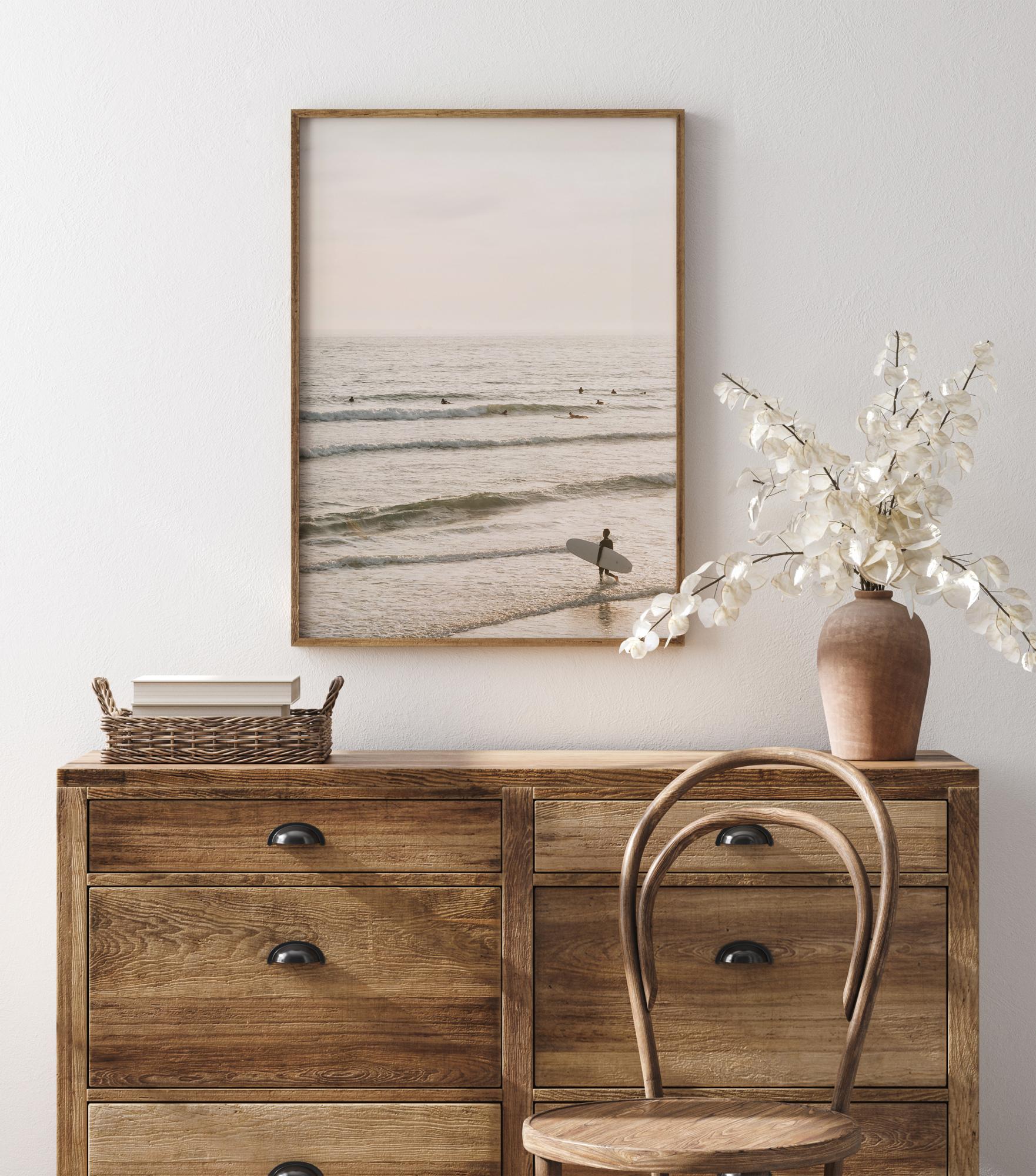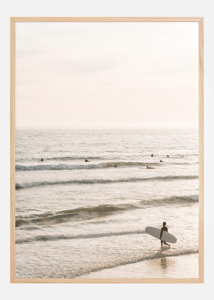 Μια αφίσα με μια απέραντη θάλασσα γεμάτη σέρφερ που περιμένουν το επόμενο μεγάλο κύμα. Μικρά κεφάλια πλέουν μακριά στη θάλασσα και ένας τελευταίος σέρφερ περπατάει μέσα στα κύματα με τη σανίδα του. Η θάλασσα είναι ήρεμη στο απαλό πρωινό φως και υπάρχει μια αίσθηση προσδοκίας στον αέρα.