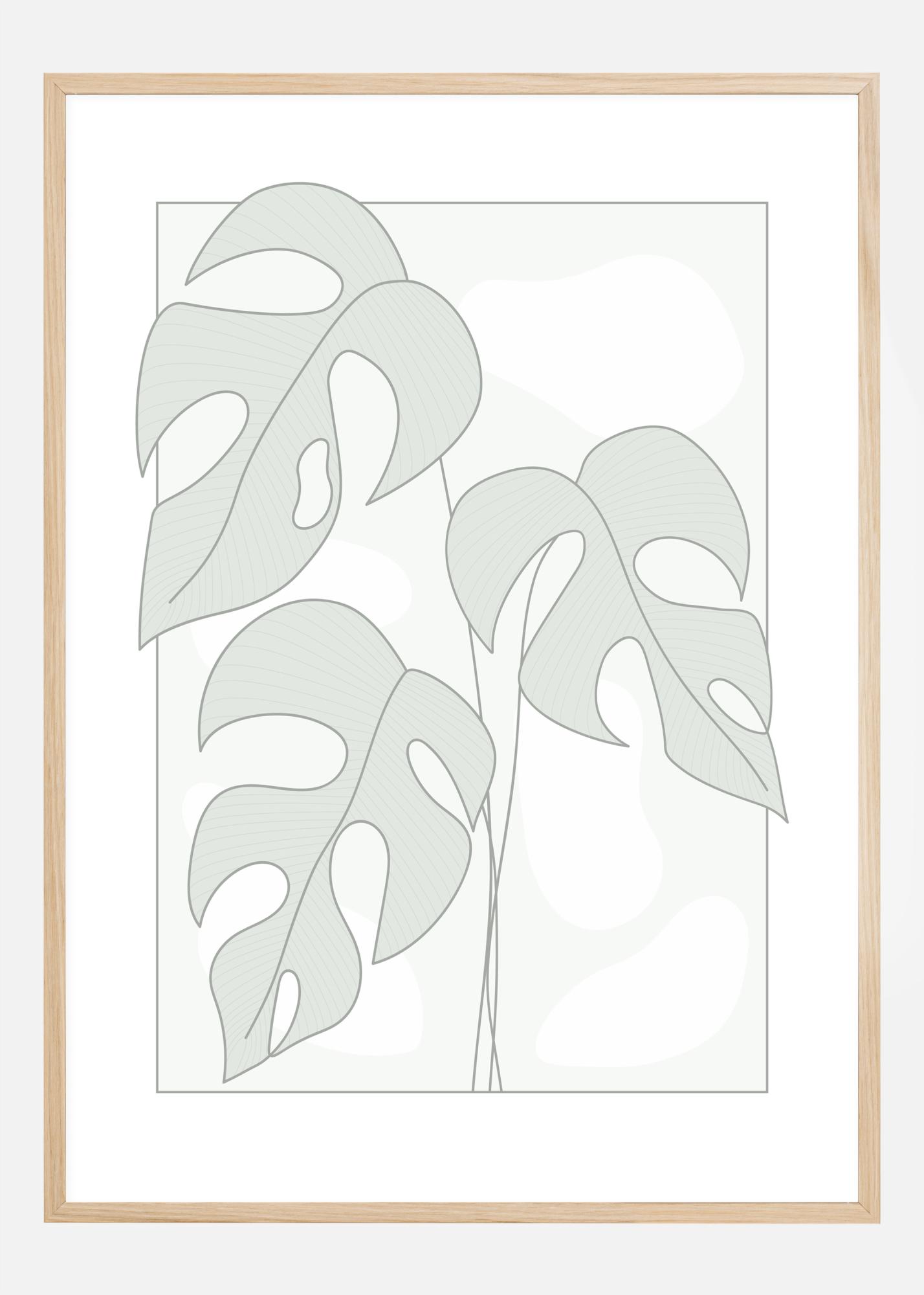 Μια απλή αφίσα με εικονογραφημένα φύλλα μονστέρας. Τρία μεγάλα φύλλα γεμίζουν την εικόνα, το καθένα σε έναν απαλό γκρίζο τόνο. Λεπτότερες γραμμές αποτελούν τα στελέχη όταν αυτά τα κομψά φύλλα με τρύπες κρέμονται σε αυτή την εικόνα. Κρατήστε το διακριτικό κρεμώντας το σε έναν απαλά πράσινο τοίχο για μια αίσθηση φύσης.