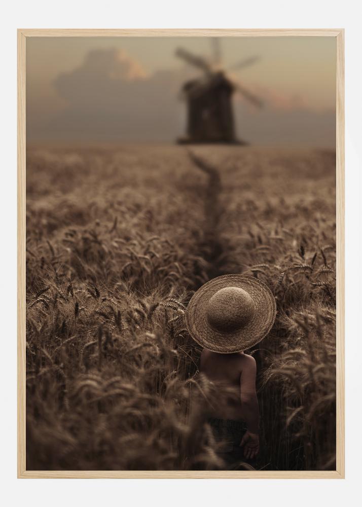 Μια αφίσα πορτραίτου ενός αγοριού σε ένα χωράφι με στάρι με έναν ανεμόμυλο στο βάθος. Τα απαλά κίτρινα και ροζ χρώματα δημιουργούν μια πραγματικά ήρεμη ατμόσφαιρα. Τολμήστε να προχωρήσετε προς τον ανεμόμυλο μαζί με το αγόρι χρησιμοποιώντας αυτήν την εικόνα.