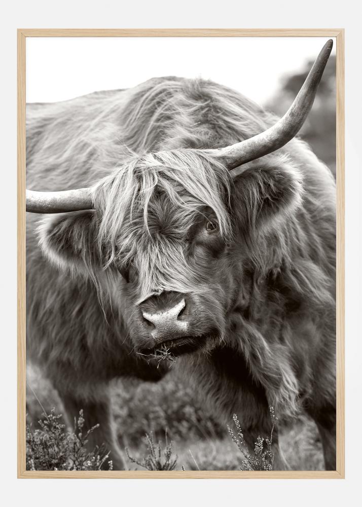 Μια αφίσα ζώου με έναν ταύρο των Υψιπέδων. Ο ταύρος γέρνει προς την εικόνα με το τρίχωμα να κρέμεται πάνω από τα μάτια του. Το ένα μάτι κοιτάζει προς την κάμερα και η μαλακή, χνουδωτή γούνα του αιχμαλωτίζει το φως καθώς κινείται. Παρά τα κέρατα, το πρόσωπο του ζώου είναι απαλό και γοητευτικό, μπορείς σχεδόν να νιώσεις τη βρεγμένη μύτη του.