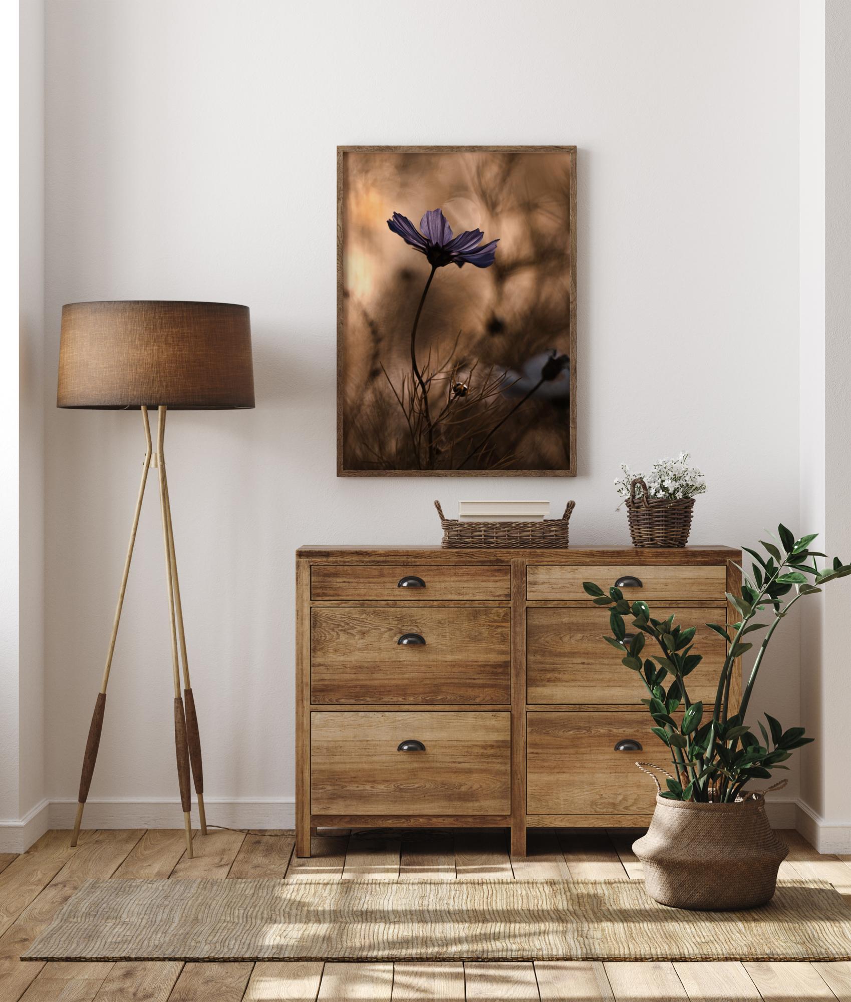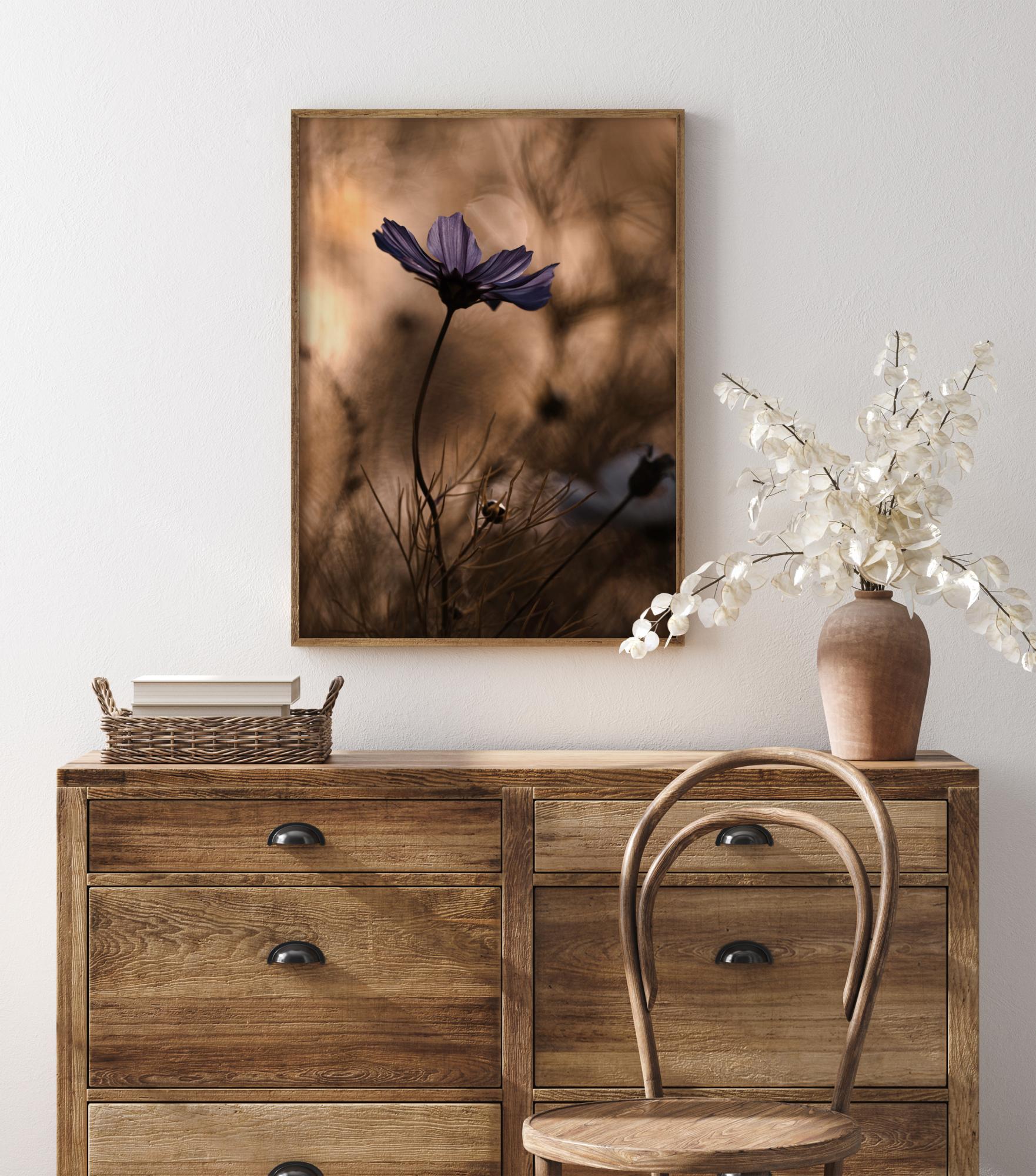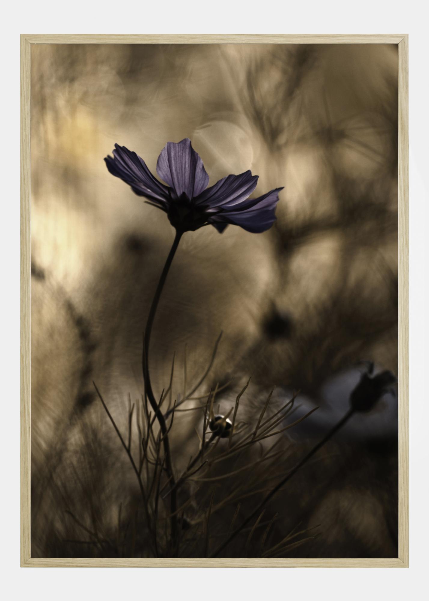 Μια αφίσα λουλουδιών με ένα ανοιχτόμωβ λουλούδι που ανεμίζει σε ένα απαλό καφέ φόντο. Τα μωβ πέταλα τονίζονται δραματικά έναντι των εστιασμένων φυτών στο υπόβαθρο. Άλλες μορφές μπορούν να φανούν καθώς η ματιά κινείται κατά μήκος των καμπύλων στελεχών για να απορροφήσει ολόκληρη την εικόνα.
