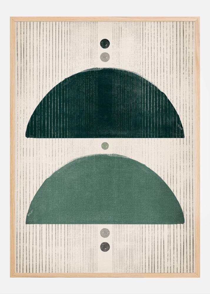 Αυτή η αφίσα είναι κάτι περισσότερο από μια διακοσμητική εικόνα· είναι μια σύγχρονη καλλιτεχνική ερμηνεία που ενώνει το φυσικό με το στιλιζαρισμένο. Οι τρεις κυκλικές μορφές, που είναι κεντραρισμένες μεταξύ των ημικυκλικών μπλοκ, λειτουργούν ως ένα κέντρο που ενοποιεί ολόκληρη τη σύνθεση. Αυτό το εκτύπωμα θα μπορούσε να χρησιμεύσει ως μια κομψή εστία στον τοίχο ενός μινιμαλιστικού σπιτιού ή γραφείου, και οι καταπραϋντικές πράσινες αποχρώσεις θα προσέφεραν μια αίσθηση φύσης και ηρεμίας σε οποιοδήποτε περιβάλλον.