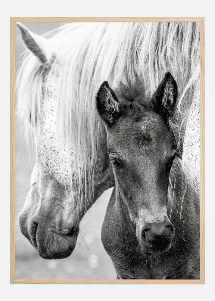 Μια αφίσα ζώων με μια φοράδα και το πουλάρι της. Η φοράδα προστατεύει το πουλάρι της και σκύβει το λευκό κεφάλι της πάνω από την πλάτη του. Το σκούρου χρώματος πουλάρι κοιτάζει προς την κάμερα από αυτή την προστασία, με τα αυτιά του να έχουν σηκωθεί από περιέργεια. Απολαύστε αυτή την γλυκιά εικόνα του μωρού.